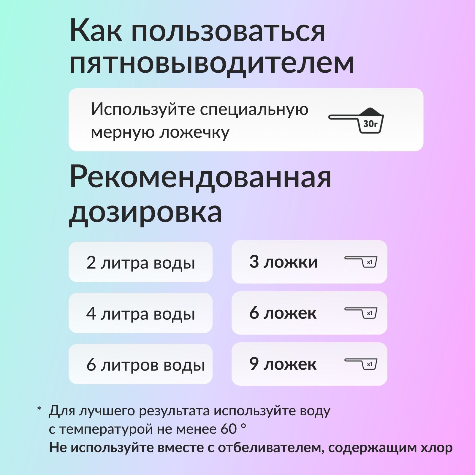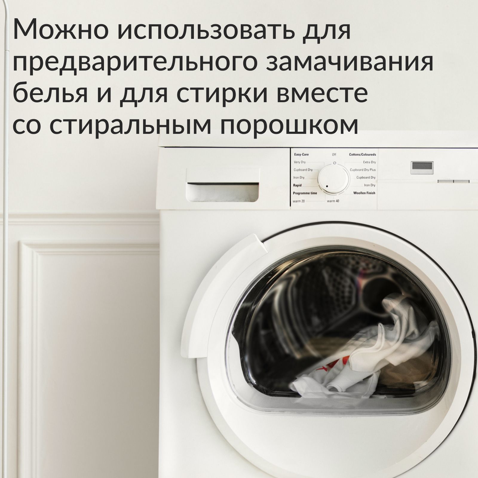 Может использоваться как для предварительного замачивания белья, так и для стирки вместе со стиральным порошком для удаления сложных пятен.