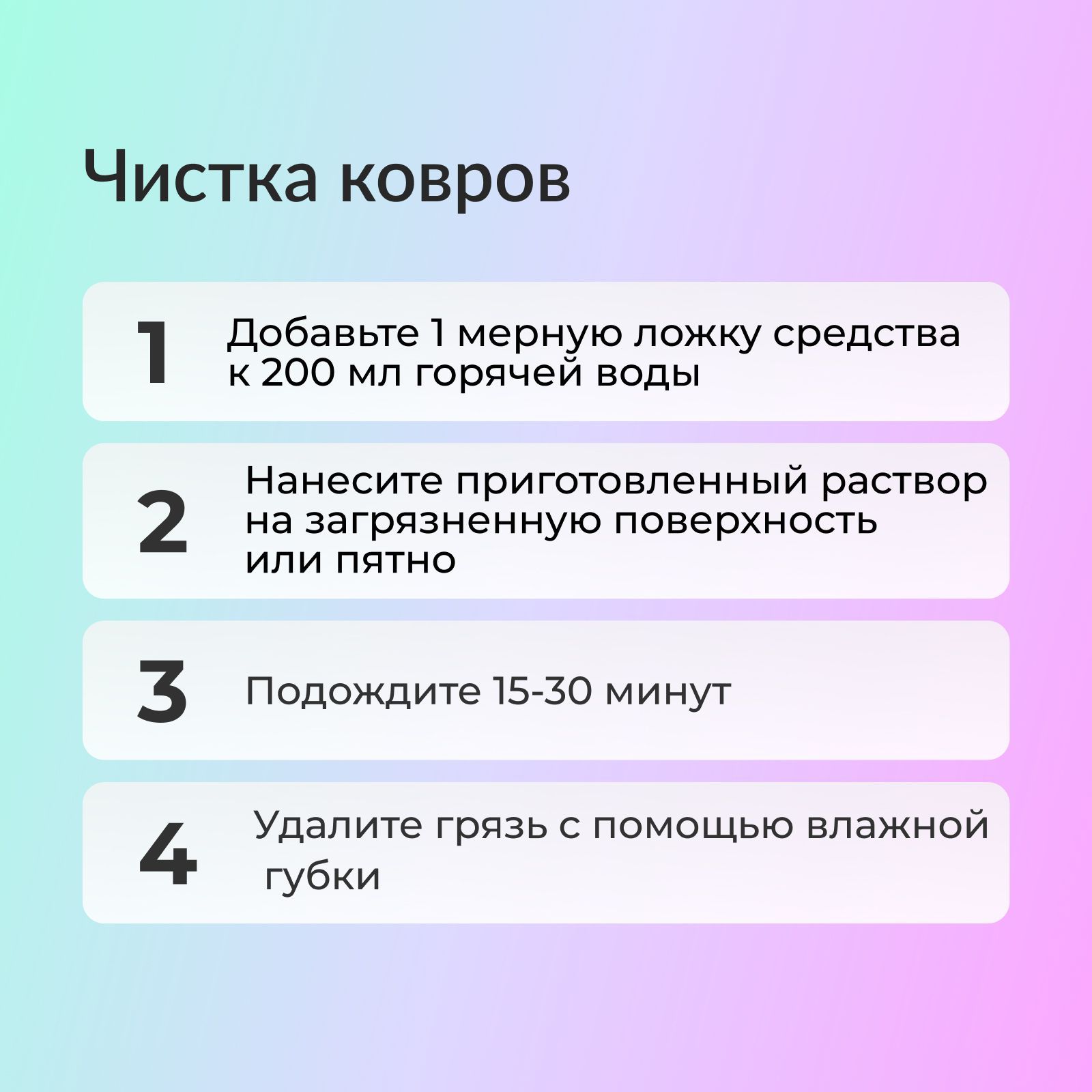 Быстро удаляет пятна с одежды, белья, обивки мебели, салона автомобиля, ковров, линолеума, кухонных поверхностей.