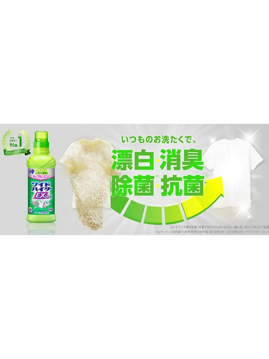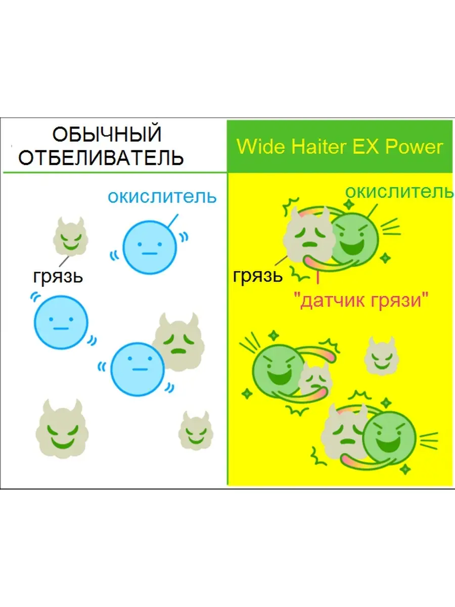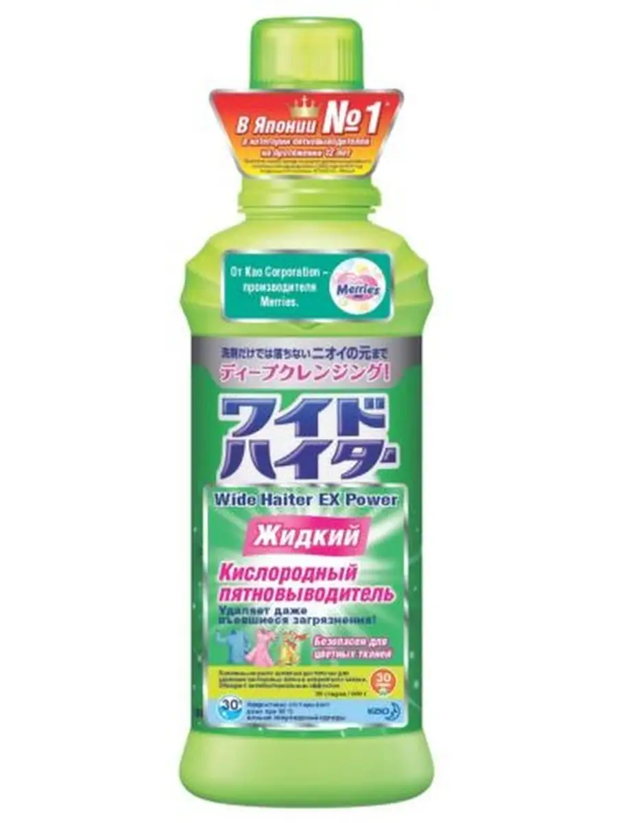 Описание: пятновыводитель кислородный, жидкий Wide Haiter EX Power, 600 мл. ЯпонияЭтот отбеливатель на протяжении 10 последних лет (с января 2010 по декабрь 2019 года) занимает первое место по объему продаж в Японии в категории кислородных отбеливателей Популярность обусловлена тем, что обычные отбеливатели благодаря химической реакции осветляют цвет грязных пятен и разводов, но сама грязь при этом остается на месте. В Wide Haiter используются "датчики грязи", которые забирают грязь с собой плотно с ней соединяясь, не давая повторно осесть на ткани и выполаскиваются в месте с этой грязью в процессе стирки Экологичен, безопасен для кожи и здоровья человека, хорошо выполаскивается из волокон тканей.Подходит для белых и цветных тканей, сделанных из хлопка, льна, смешанных и синтетических волокон, а также для деликатных тканей из шерсти и шелка. С легким цветочным ароматом. В случае если вы наносите отбеливатель на пятна, ждать воздействия отбеливателя не рекомендуется, оптимально сразу же приступить к стирке, не допуская высыхания пятновыводителя на одежде!