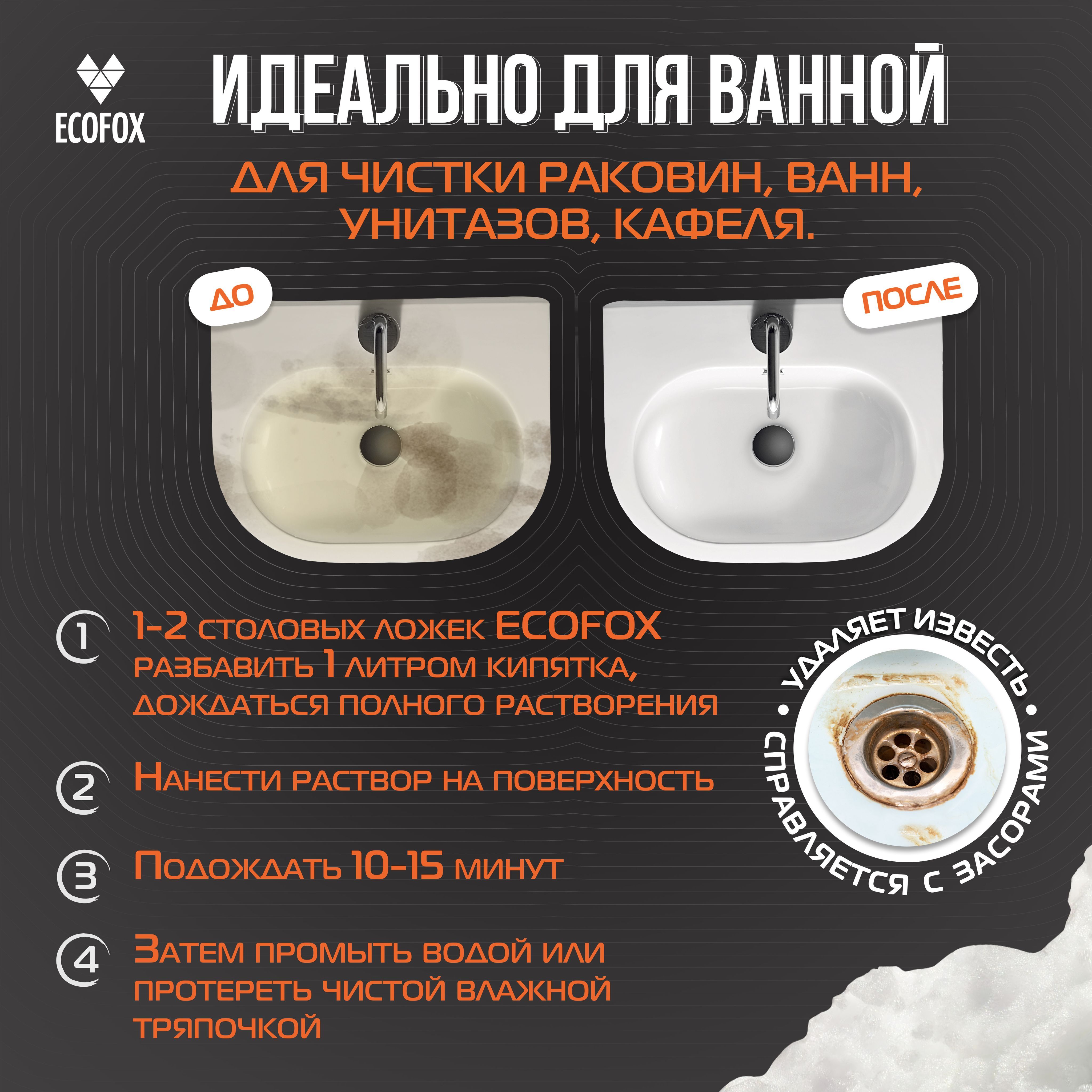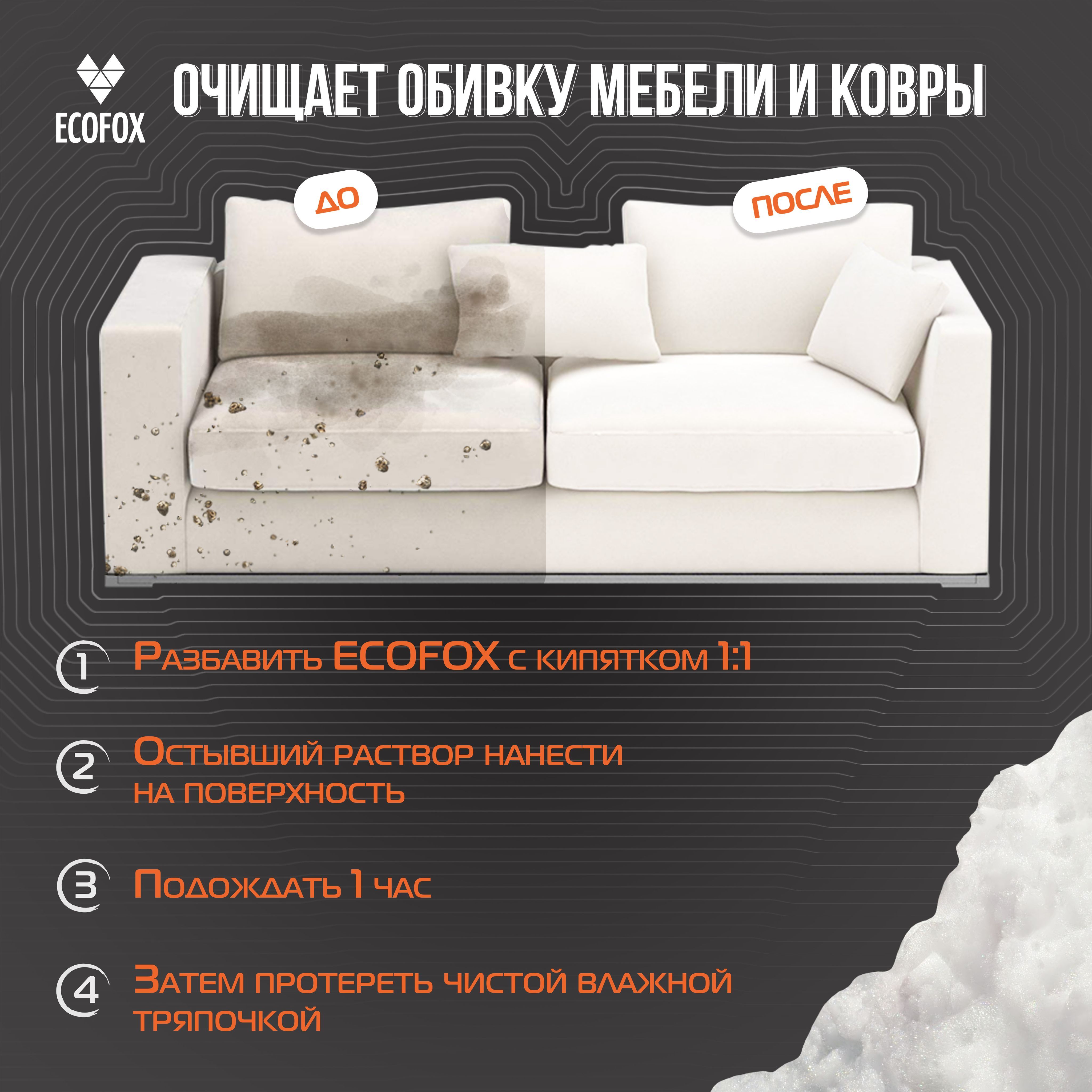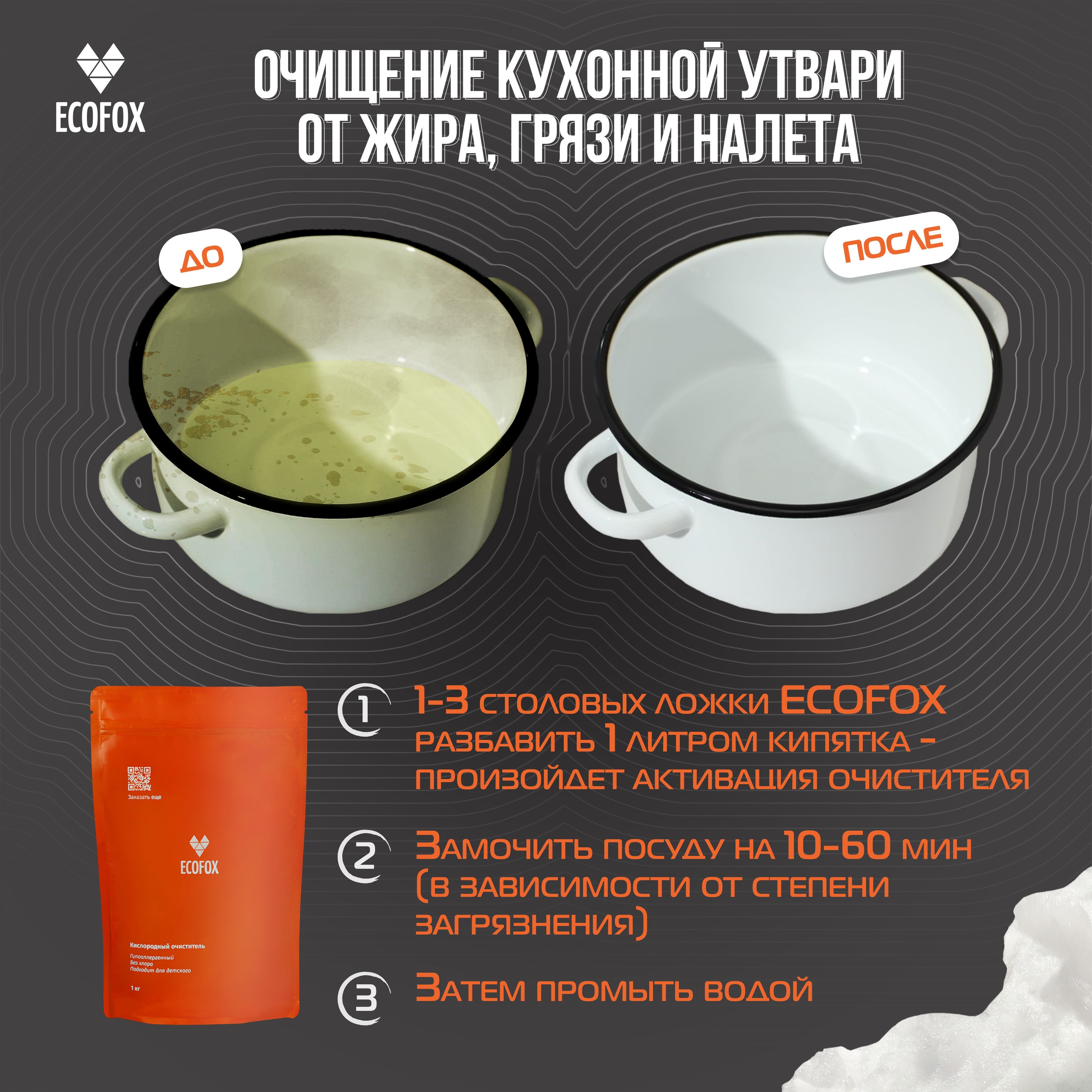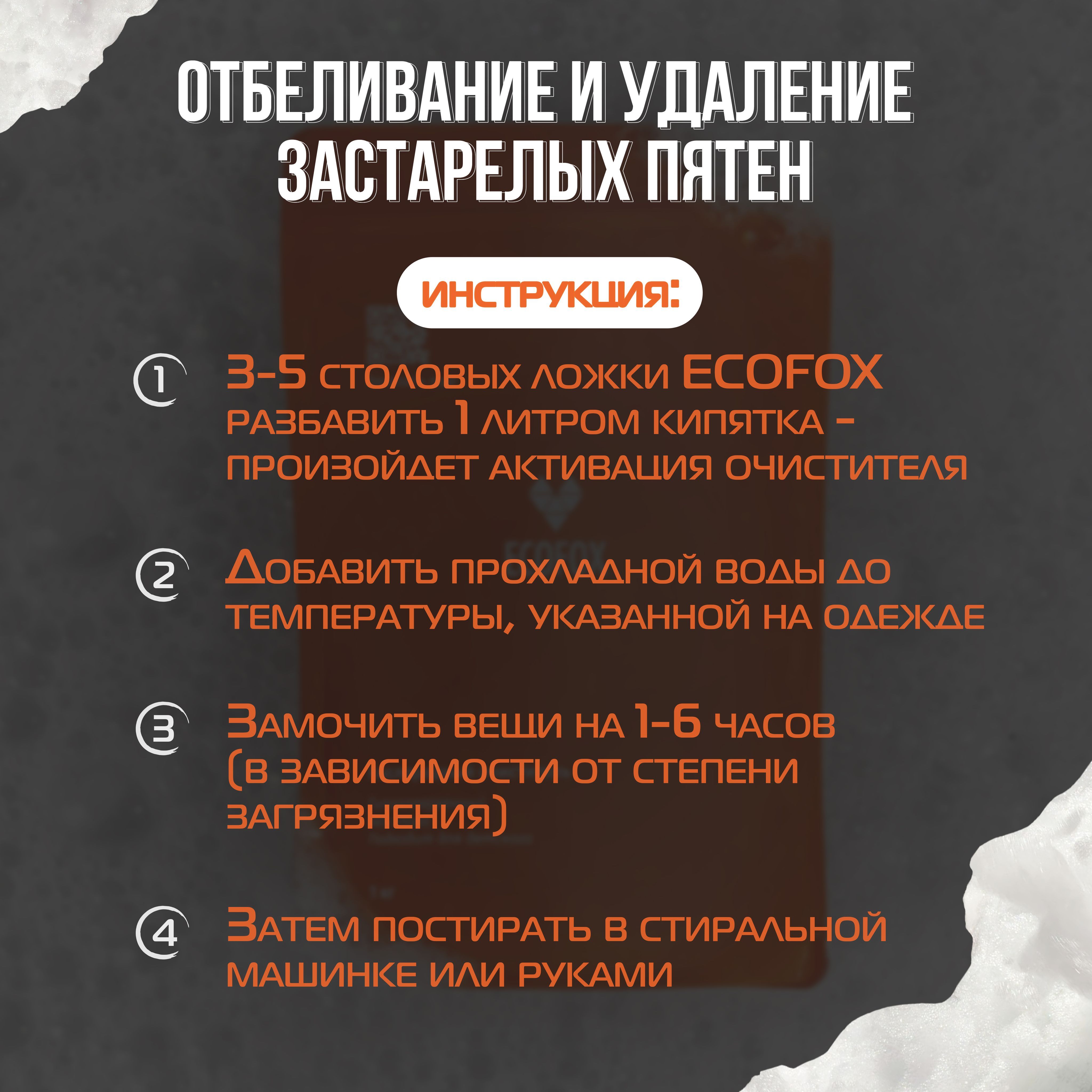 Эффективность средства видна на фотографиях наших покупателей.Очиститель ECOFOX - это экологически чистый продукт, который не содержит вредных химических веществ, фосфатов, отдушек. Он идеально подходит для аллергиков и новорожденных. Безопасен для септиков.Пятновыводитель эффективно справляется с трудновыводимыми,  застарелыми пятнами от травы, ягод, крови, вина, от пота и дезодоранта, жира, масла и любые другие органические загрязнения. При этом действующее вещество не портит структуру ткани и не действует на неорганические красители.Дезинфицирующее чистящее средство универсальное также подойдет для чистки кухонной утвари, снятия нагара с посуды, удаления старого пищевого налета, чайного и кофейного налета.Мы тщательно следим за изготовлением и качеством товара, чтобы Вы радовались покупке в нашем магазине. Заказывайте и Вы убедитесь в этом!МЕРЫ ПРЕДОСТОРОЖНОСТИ
