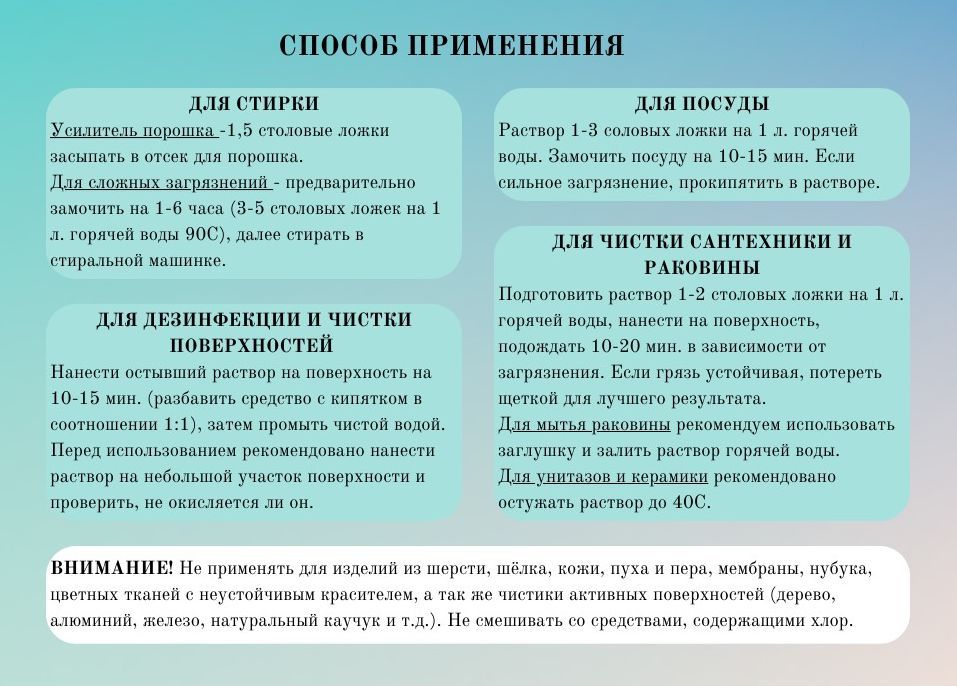 Особенности применения: Антибактериальный эффект, Гипоаллергенность, Отбеливание, Экосредство