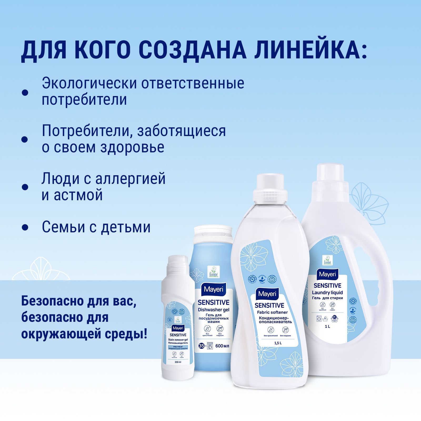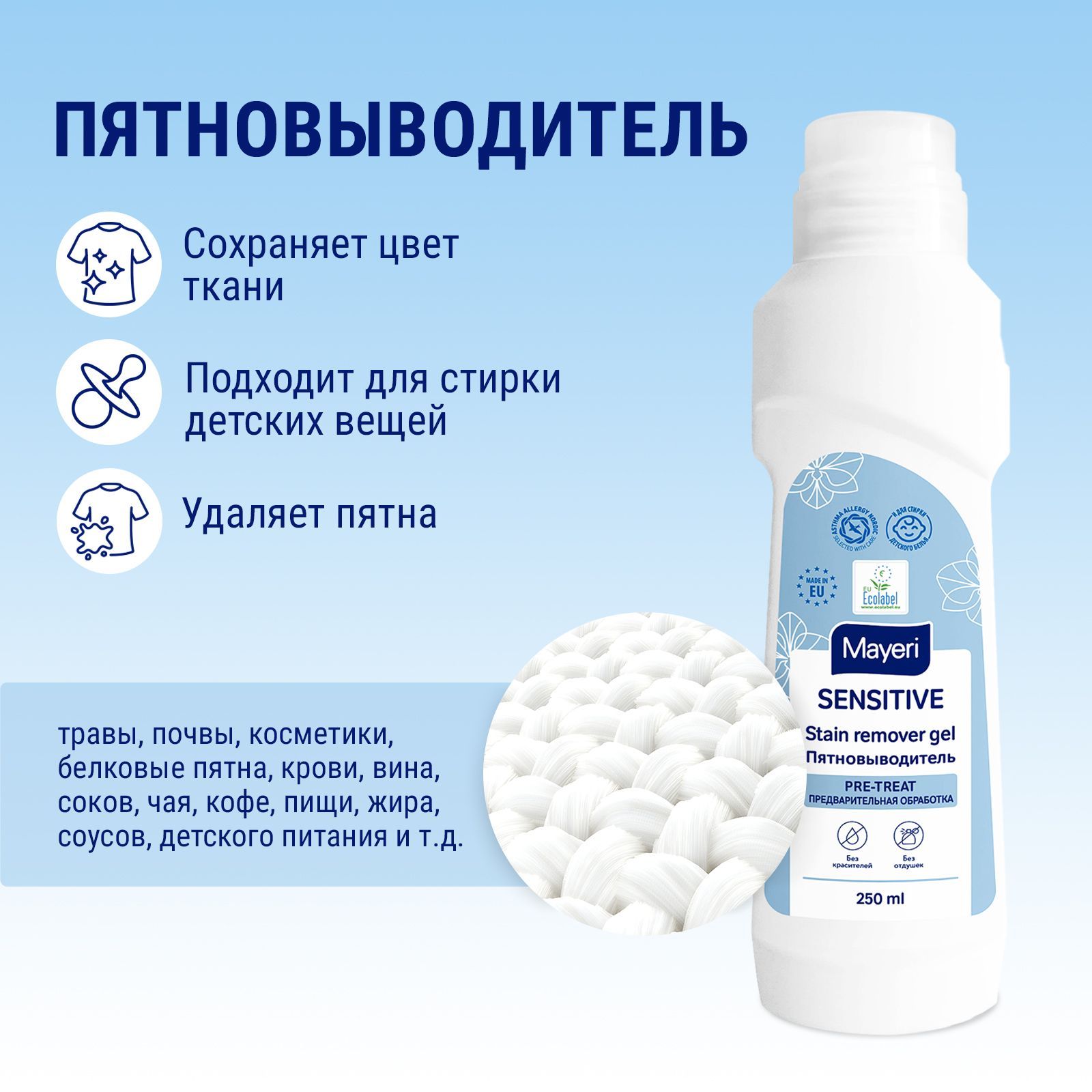 Универсальный эко пятновыводитель поставляется в удобном флаконе объемом 250 мл. Не содержит красителей и искусственных ароматизаторов, а также не тестируется на животных. Производитель линейки Mayeri Sensitive создал продукт специально для экологически ответственных потребителей, заботящихся о своем здоровье, а также для людей с аллергией, астмой и чувствительной кожей. Вся продукция Mayeri Sensitive имеет сертификаты ECOLABEL и ASTHMA ALLERGY.