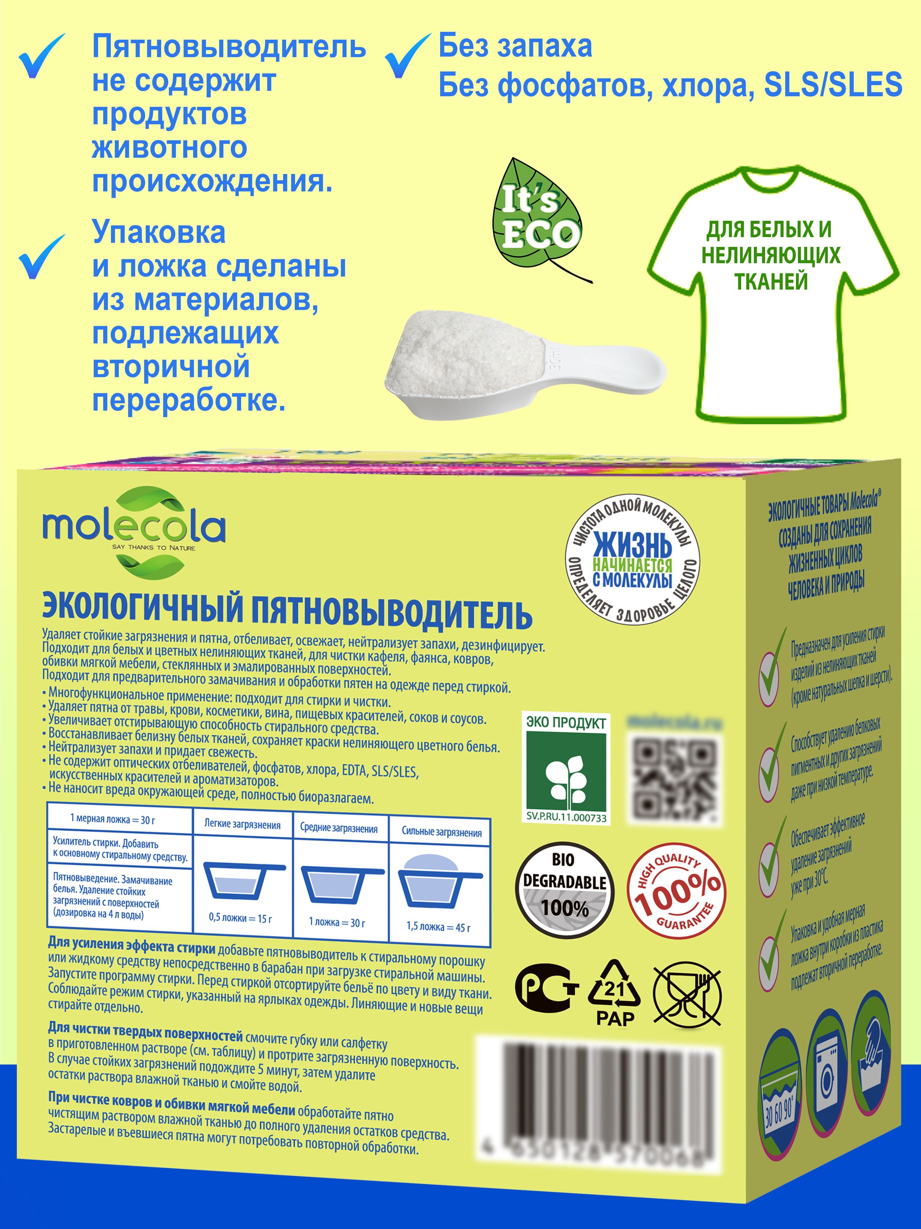 Пятновыводитель на основе активного кислорода Molecola, экологичный, для стирки цветного и белого белья, 600 г