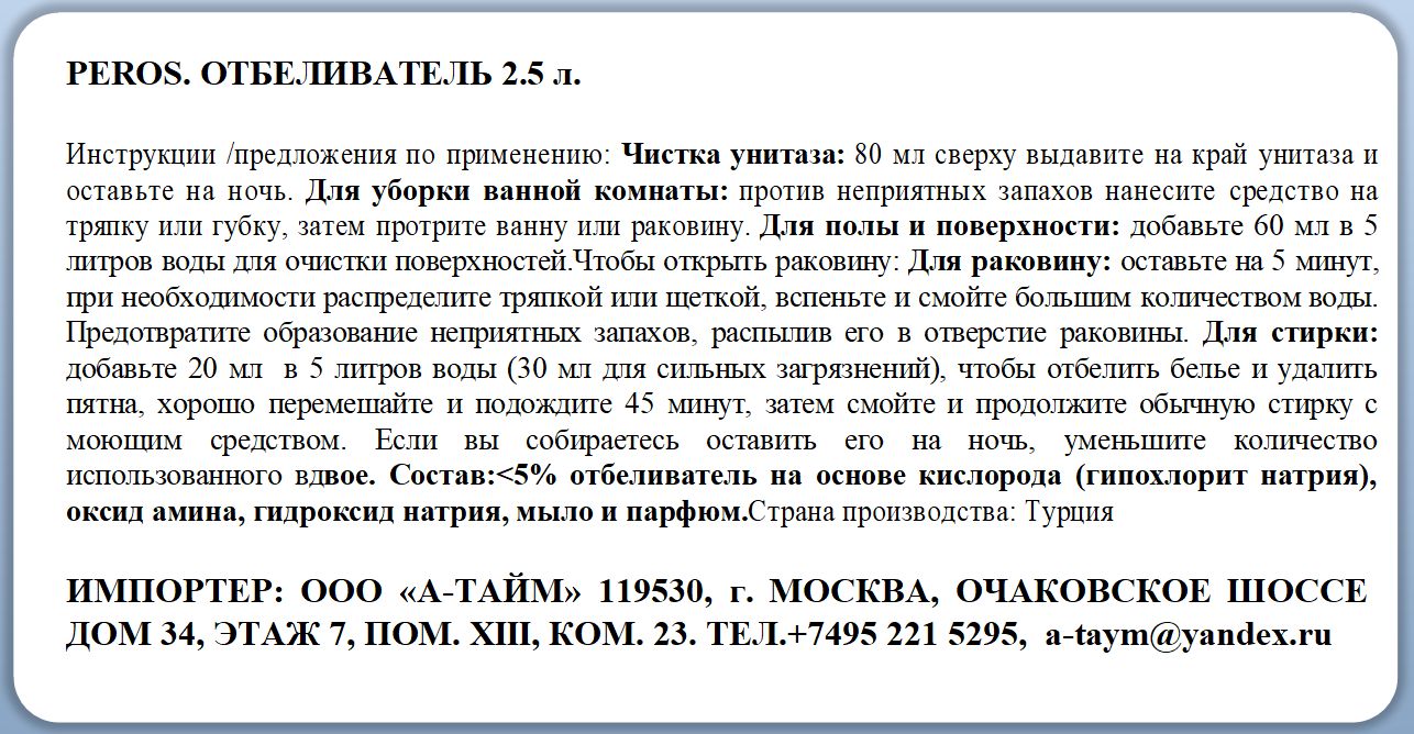 Описание: Пятновыводитель отбеливатель для белья Peros - это в том числе и универсальное чистящее средство для ванной, кухни, унитаза, раковины, полов и других поверхностей в вашем жилье. Благодаря своей формуле, содержащей активные молекулы кислорода, он легко избавит вас от пятен на одежде, поможет вернуть вещам белизну и ощущение новизны, станет незаменимым помощником в быту в обеспечении первоклассной дезинфекции поверхностей, максимальной гигиене и уборке в качестве чистящего средства для помещений и сантехники. Отбеливатель Peros при его регулярном использовании позволит вам и вашим близким жить в более чистой и гигиеничной среде, обеспечит блеск, чистоту, гигиену и свежесть своим парфюмированным запахом.