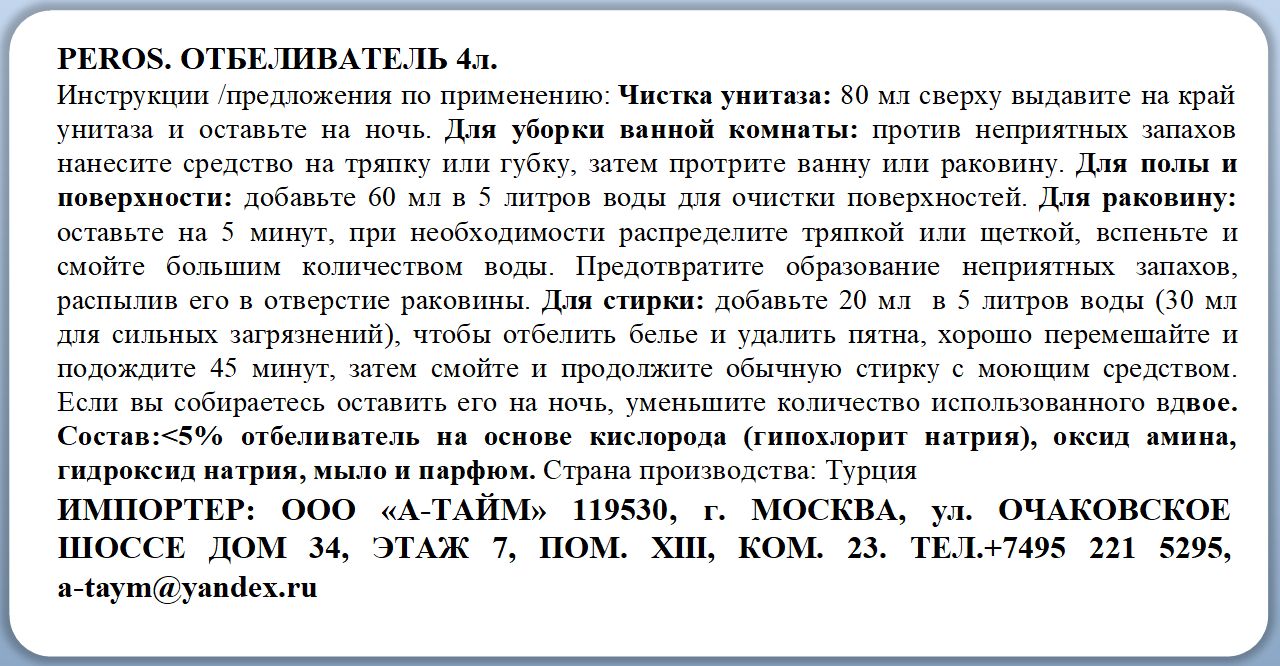 Описание: Пятновыводитель отбеливатель для белья Peros - это в том числе и универсальное чистящее средство для ванной, кухни, унитаза, раковины, полов и других поверхностей в вашем жилье. Благодаря своей формуле, содержащей активные молекулы кислорода, он легко избавит вас от пятен на одежде, поможет вернуть вещам белизну и ощущение новизны, станет незаменимым помощником в быту в обеспечении первоклассной дезинфекции поверхностей, максимальной гигиене и уборке в качестве чистящего средства для помещений и сантехники. Отбеливатель Peros при его регулярном использовании позволит вам и вашим близким жить в более чистой и гигиеничной среде, обеспечит блеск, чистоту, гигиену и свежесть своим парфюмированным запахом.