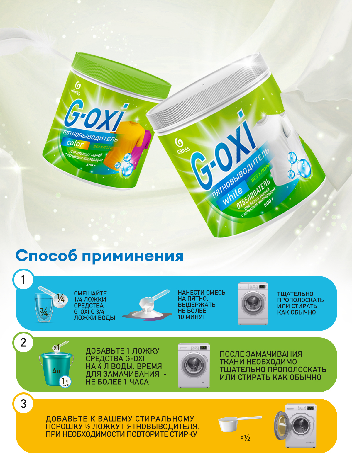 Описание: Пятновыводитель отбеливатель для белья с активным кислородом GRASS G-OXI для белого белья 500гр - универсальное чистящее средство на основе активного кислорода для удаления загрязнений пятен травы, вина, крови, фломастера, чернил, масла, жира, плесени. Кислородный отбеливатель с мерной ложкой (внизу банки) бережно отбеливает, устраняет запах. Благодаря нано-формуле, кислородный отбеливатель для стирки в десятки раз мощнее перкарбонат натрия и белизны. Гель для стирки, он же жидкий порошок для стирки, стиральный порошок, таблетки и капсулы для стирки, а также любые другие средства для стирки идеально подходят к данному пятновыводителю под любой тип белья. Пятновыводитель отбеливатель можно использовать как отбеливающая добавка для замачивания и отбеливания посуды, одежды. Пятновыводитель - мощное чистящее средство на основе сильнодействующего кислорода. Средство для выведения пятен не содержит хлор, фосфаты и красители. Безопасен для окружающей среды.