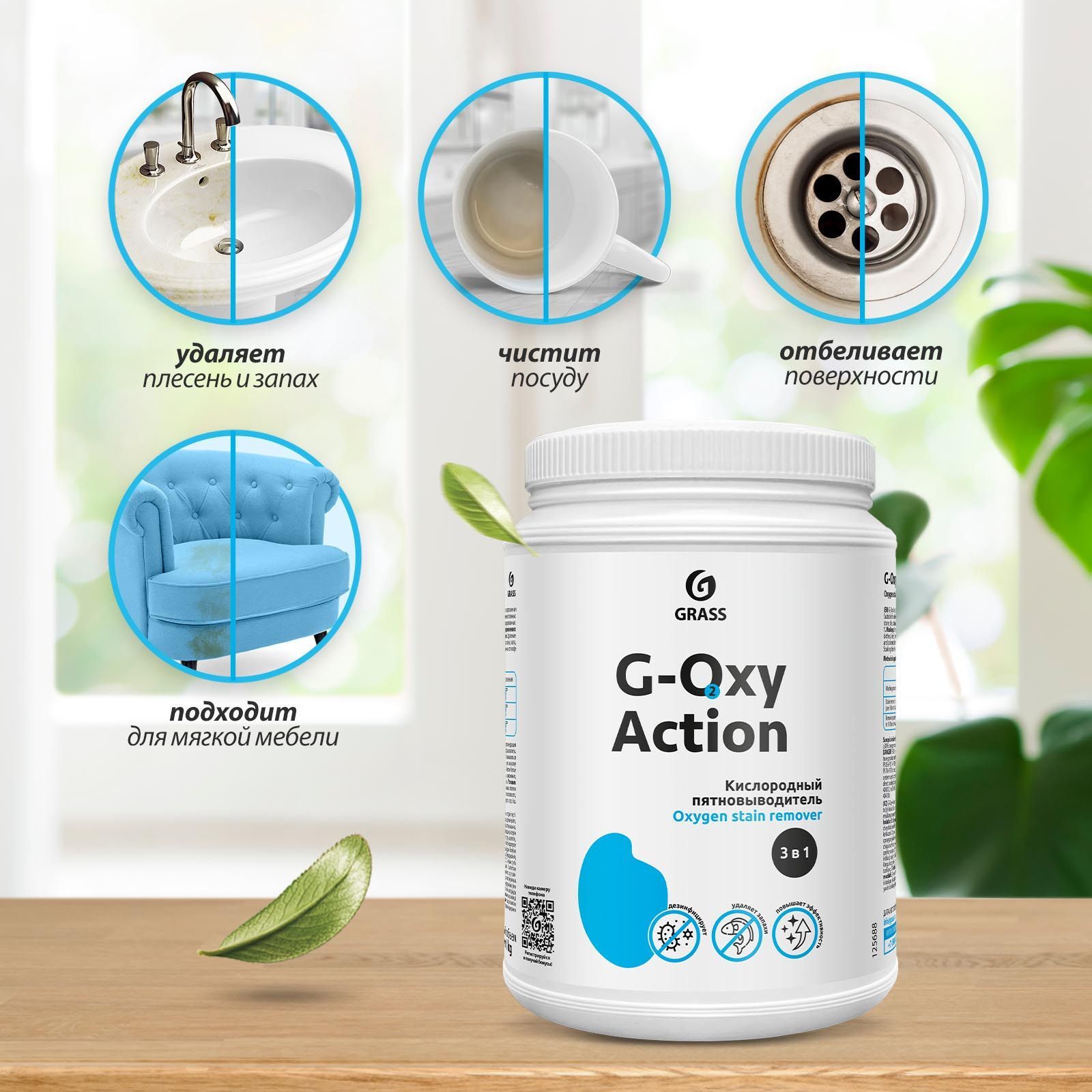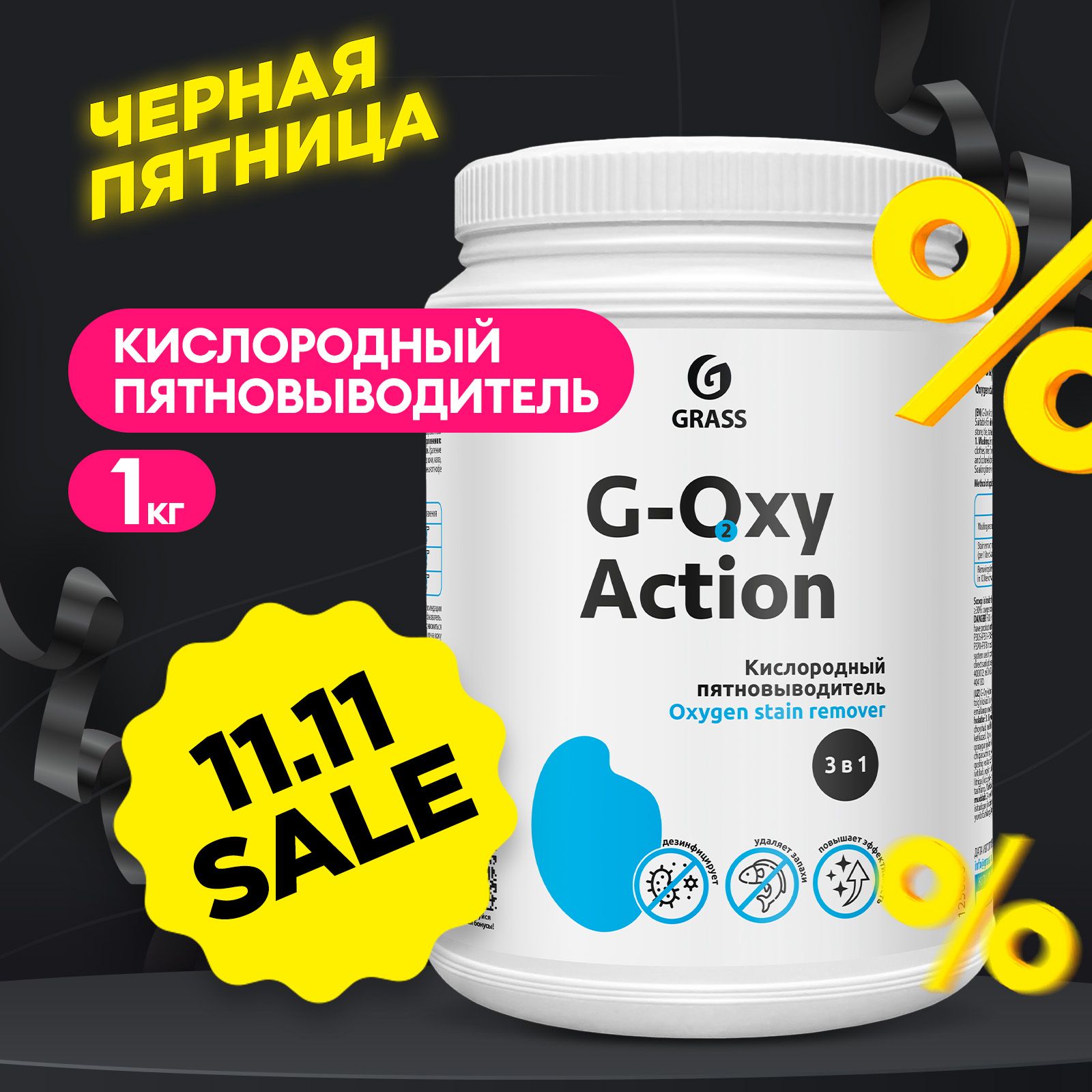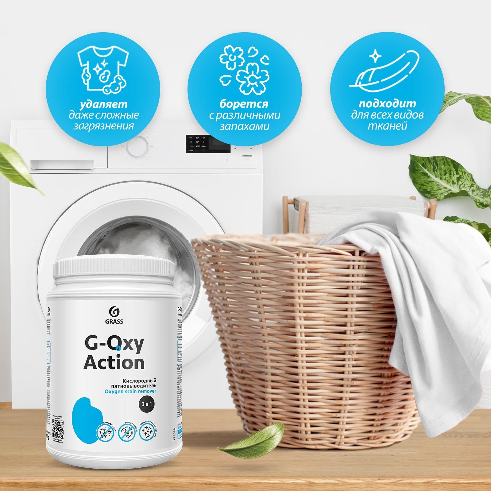 Пятновыводитель / отбеливатель GRASS G-OXY Action 1кг для белого белья, детского и цветного белья, гипоаллергенный, универсальный, перкарбонат натрия