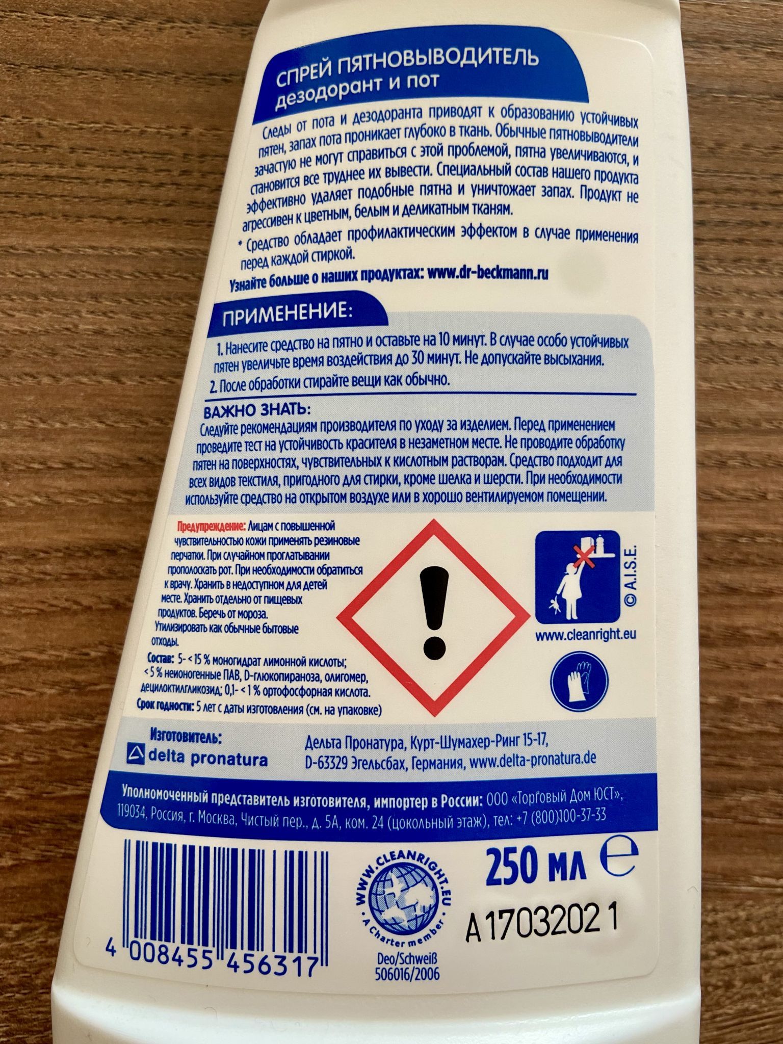 Следы от пота и дезодоранта приводят к образованию устойчивых пятен, запах пота проникает глубоко в ткань. Обычные пятновыводители не могут с этим справиться, пятна становятся больше, и после каждой носки их все труднее вывести. Но со спреем-пятновыводителем Dr. Beckmann "Дезодорант и пот" Вы можете забыть о проблемах с пятнами. Специальный состав продукта эффективно удаляет такие пятна и уничтожает запах.
