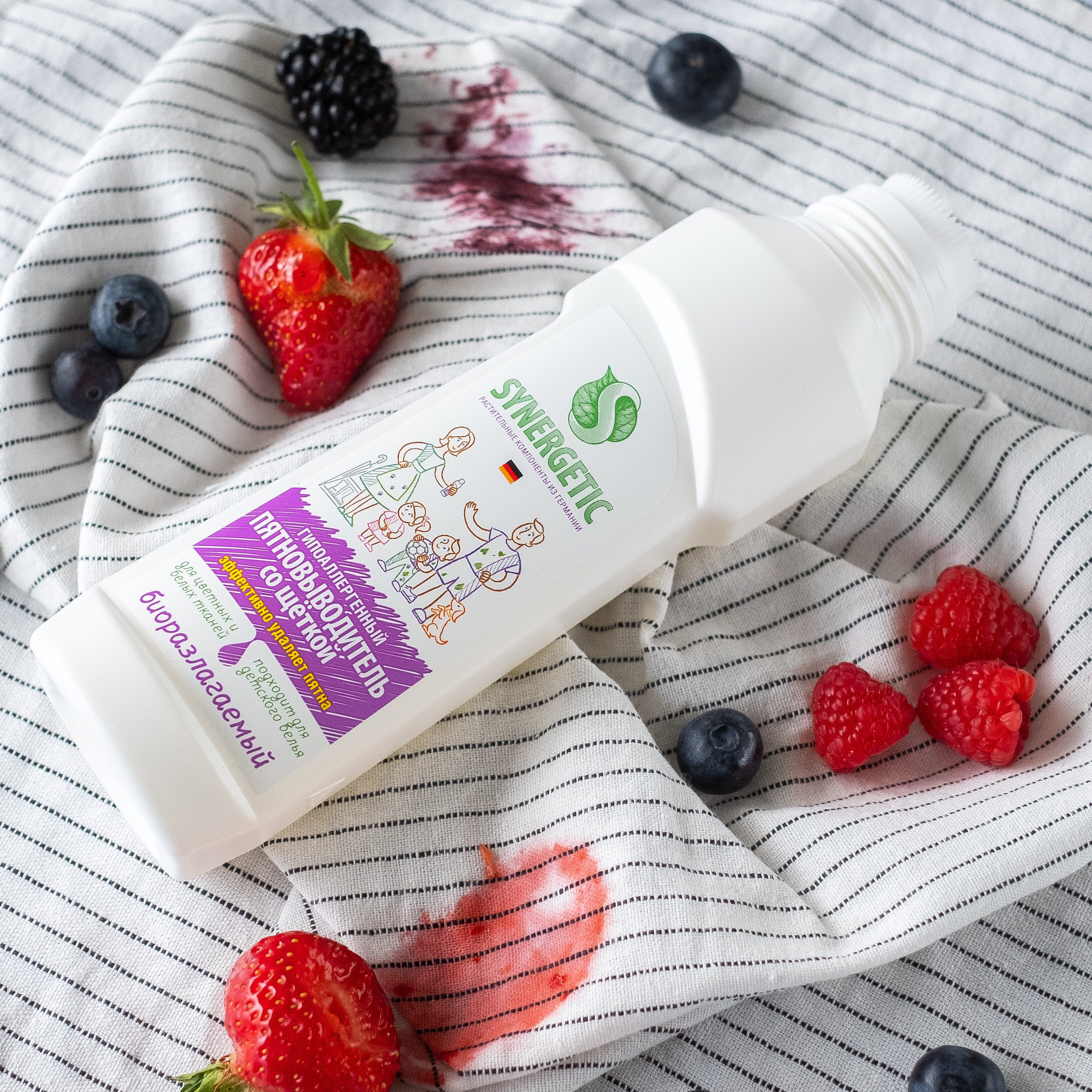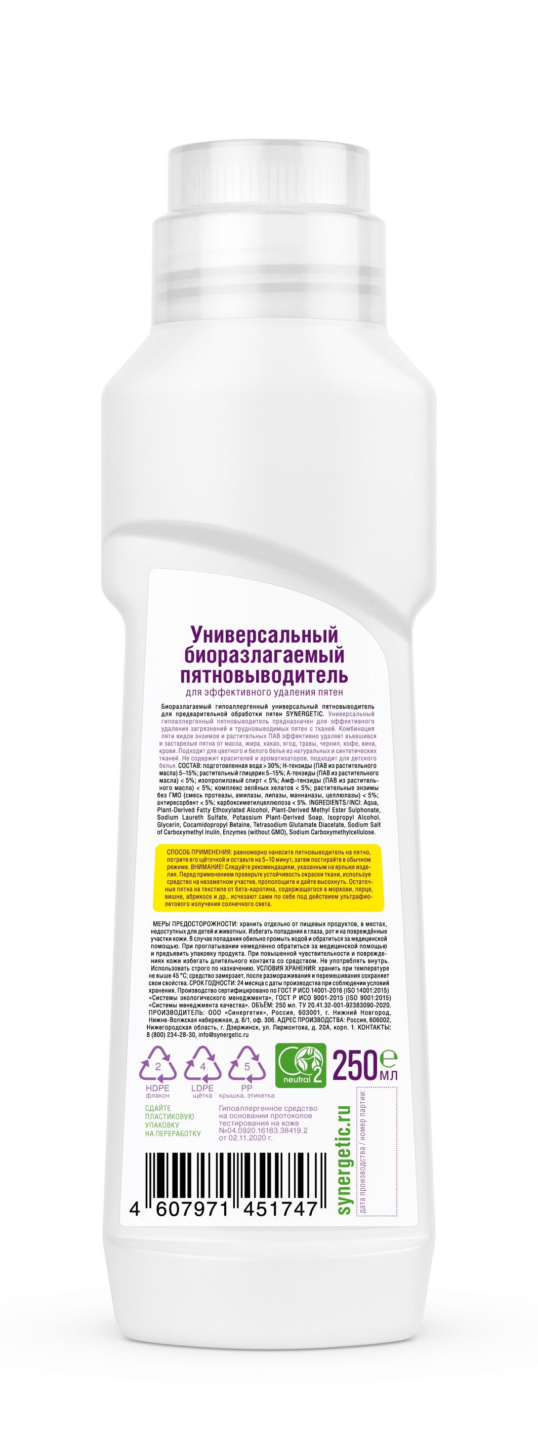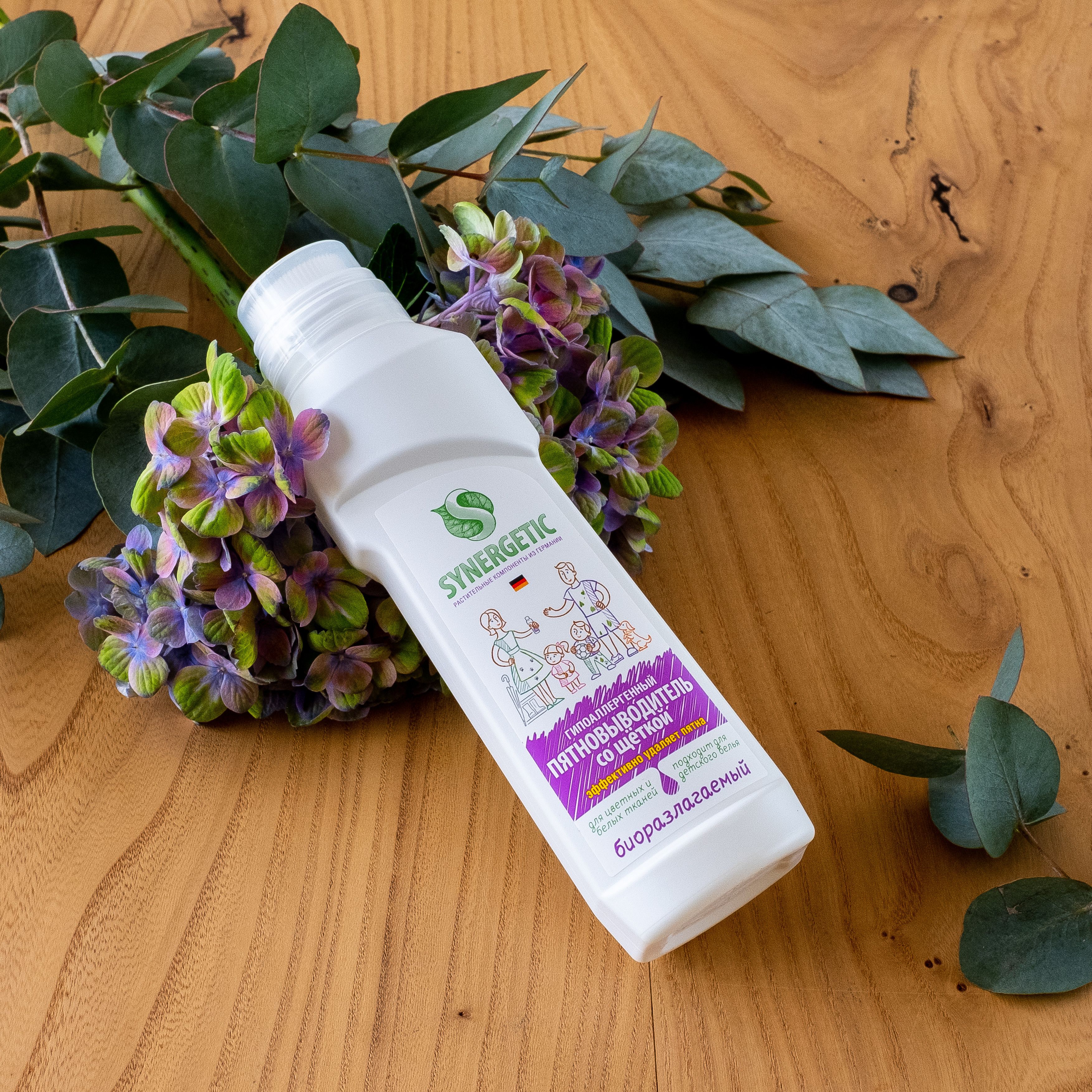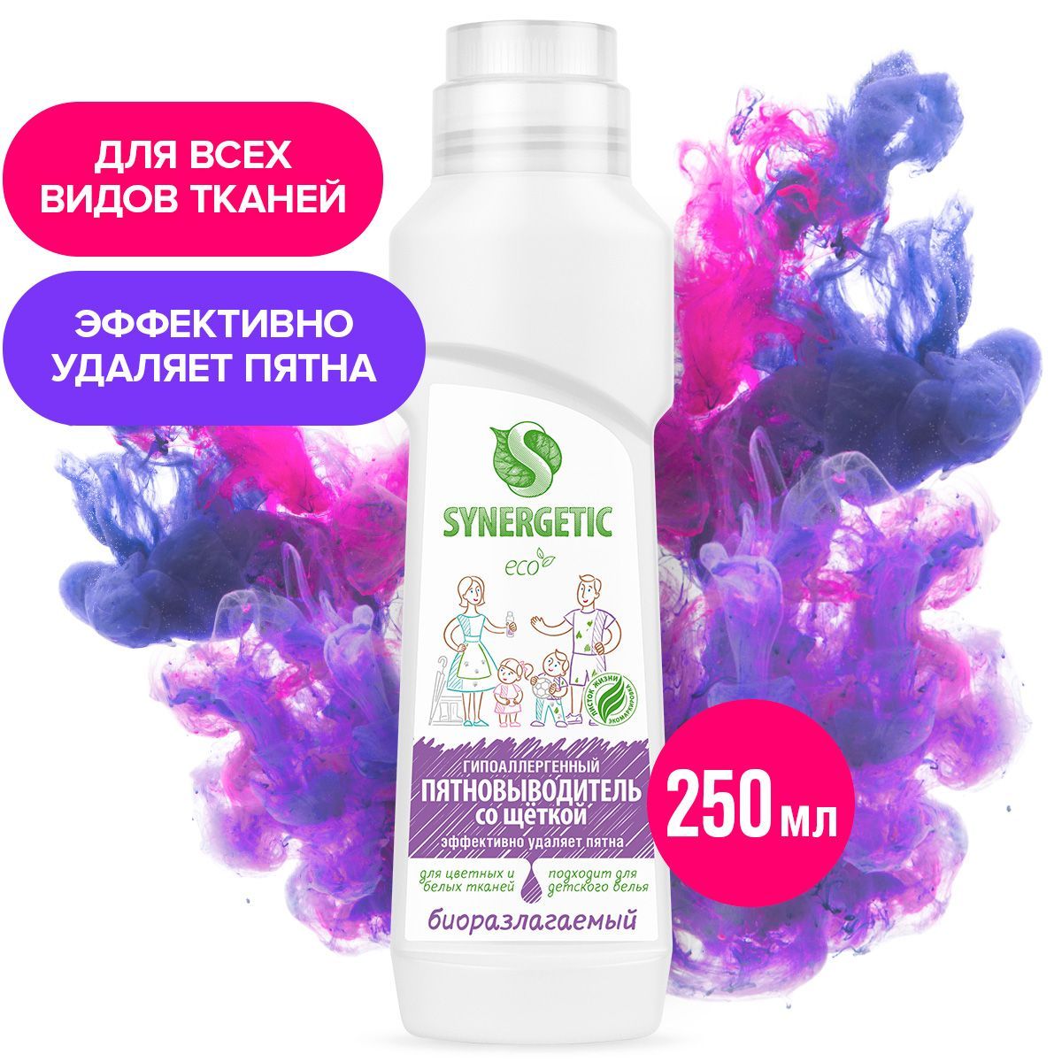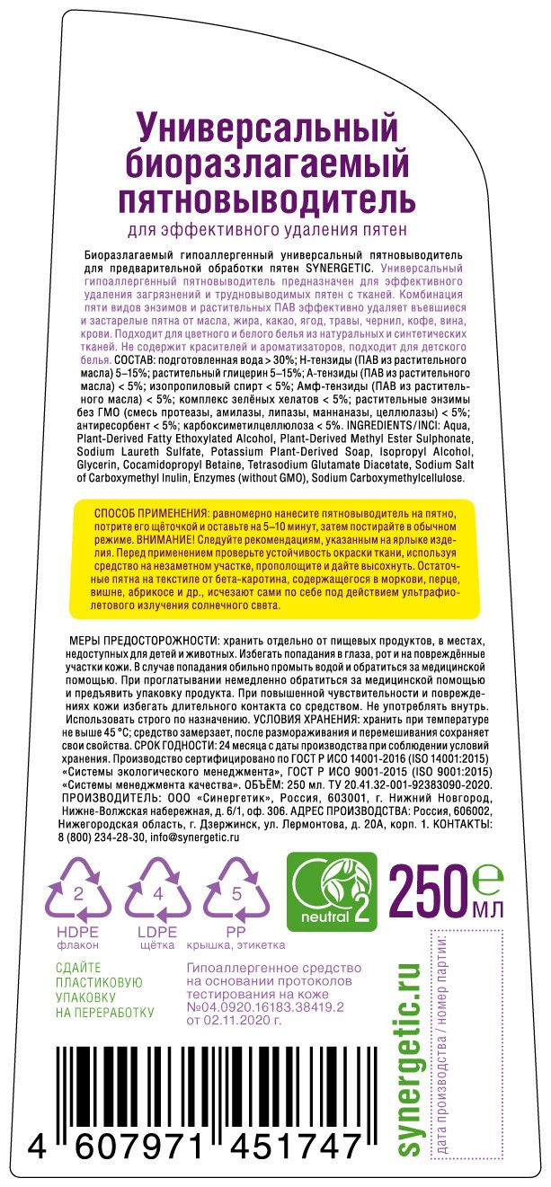 Описание: О продукте:Биоразлагаемый гипоаллергенный универсальный пятновыводитель SYNERGETIC с щёткой – универсальное средство для эффективного удаления загрязнений и трудновыводимых пятен от масла, жира, какао, ягод, травы, чернил, кофе, вина, крови на белом и цветном белье из натуральных и синтетических тканей. Удобный флакон с щёточкой идеально подходит для предварительной обработки пятен. Гипоаллергенный пятновыводитель подходит для детского белья. Полностью выполаскивается из волокон ткани. Не содержит красители, ароматизаторы, фосфаты, фосфонаты, акрилаты, агрессивные ПАВ, ЭДТА, оптические отбеливатели.Комбинация пяти видов энзимов (протеаза, амилаза, целлюлаза, липаза, маннаназа) и растительных ПАВ эффективно удаляет загрязнения и застарелые пятна с волокон ткани.Пятновыводитель SYNERGETIC не вредит микрофлоре септических установок и биоразлагается в условиях естественной среды.