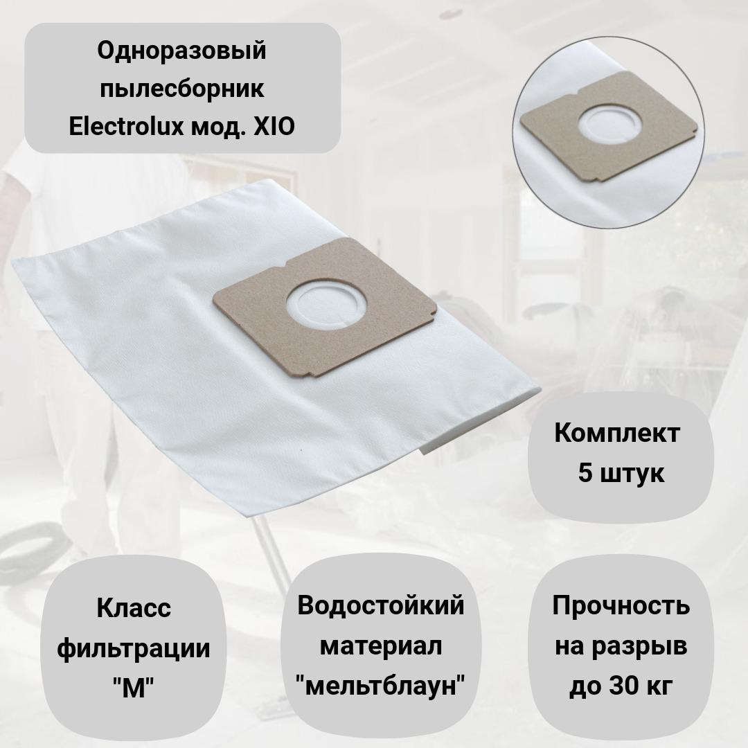 Описание: Мешки для пылесоса ELECTROLUX XIO - 5 штук. изготовлены из многослойной синтетической ткани повышенной плотности. Комбинация нескольких слоев композитного материала улучшает прочность и качество фильтрации мешков для пыли. В результате точного подбора состава материала достигнут класс фильтрации мешка «М».