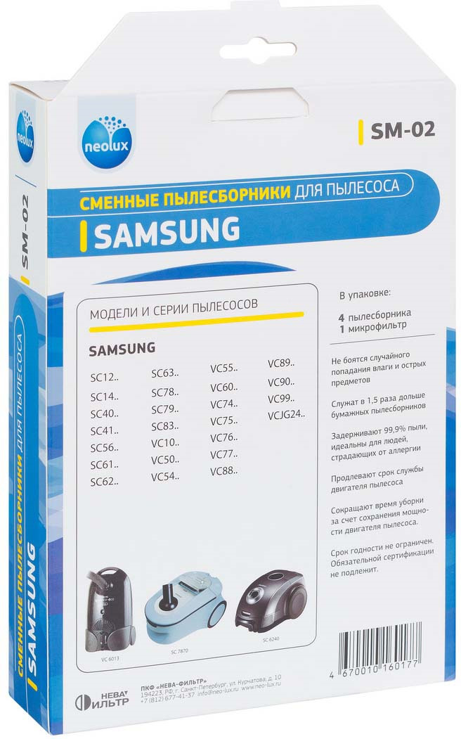 Описание: Пылесборники для пылесосов SAMSUNG. Пылесборники NEOLUX SM-02 (соответствует артикулу VP-78M) предназначены для пылесосов SAMSUNG серий: NC 55..., NC 62..., NC 70..., NC 72..., NC 75..., NC 80..., NV 70..., NV 72..., NV 75..., NV 80..., NV 90..., RC 55..., RC 58..., RC 60..., RC 74..., RC 77..., RC 80..., RC 89..., RC 90..., SC 12..., SC 14..., SC 1400, SC20F..., SC21F..., SC 31..., SC 40..., SC 41..., SC 51..., SC 52..., SC 53..., SC 54..., SC 56..., SC 61..., SC 62..., SC 63..., SC 69..., SC 70..., SC 72..., SC 75..., SC 78..., SC 79..., SC 83..., VC 10..., VC 50..., VC 54..., VC 55..., VC 58..., VC 59..., VC 60..., VC 61..., VC 62..., VC 63..., VC 64..., VC 67..., VC 68..., VC 69..., VC 70..., VC 71..., VC 74..., VC 75..., VC 76..., VC 77..., VC 86..., VC 88..., VC 89..., VC 90..., VC 99..., VCJG 24..., VCJG 246, VCJG 248. Изготовлены из пятислойного микроволокна. Задерживают 99,9 % пыли, идеальны для людей, страдающих аллергией. Не боятся случайного попадания влаги и острых предметов. Служат в 1,5 раза дольше бумажных пылесборников. Продлевают срок службы двигателя пылесоса. Сокращают время уборки за счет сохранения мощности двигателя пылесоса. В комплект входит универсальный фильтр защиты двигателя размером 125х195 мм.
