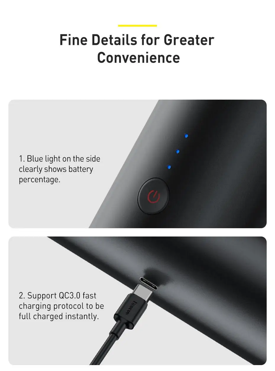 Нажмите кнопку питания в течение 3 секунд, чтобы включить светильник, чтобы четко осветить темные углы и зазоры в автомобиле для тщательной очистки.