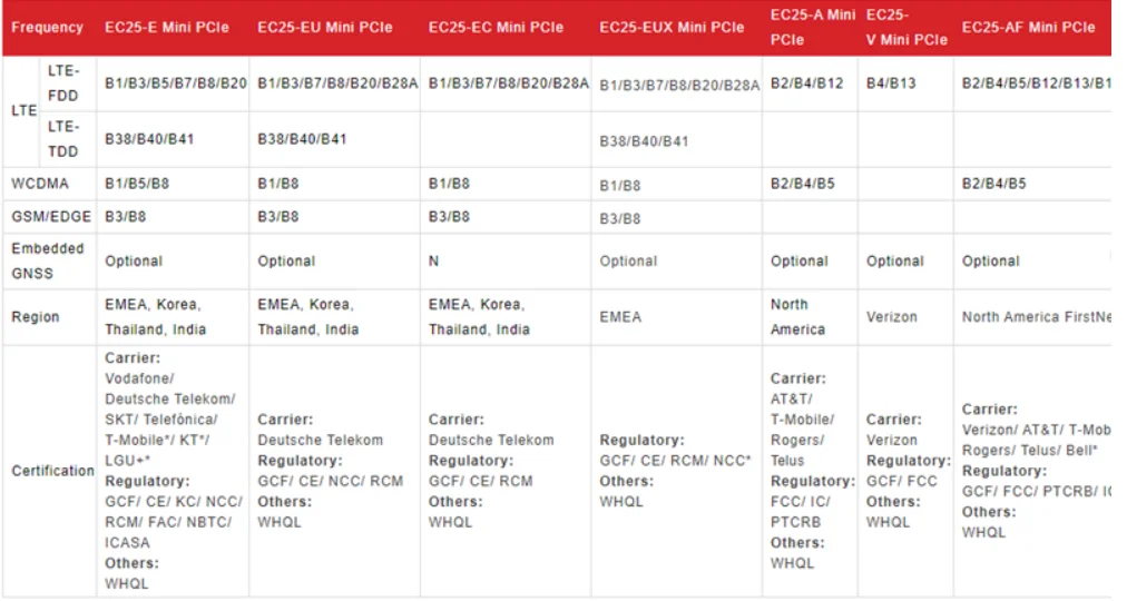 EC25 Mini PCIe содержит 5 вариантов: EC25-J Mini PCIe, EC25-E Mini PCIe, EC25-AU Mini PCIe, EC25-V Mini PCIe и EC25-A Mini PCIe. Это делает его обратно совместимым с существующими сетями EDGE и GSM/GPRS, гарантируя, что он может быть подключен даже в отдаленных районах, лишенных покрытия 4G или 3G.