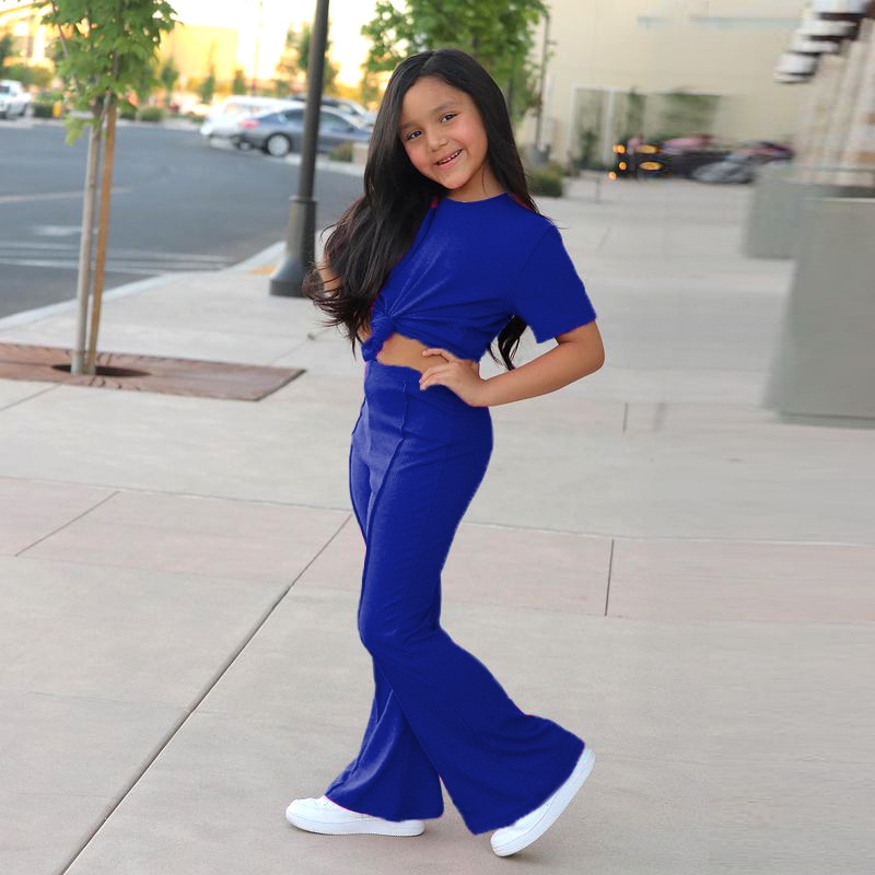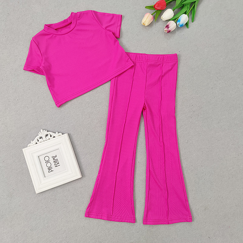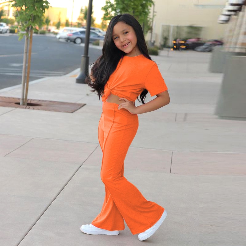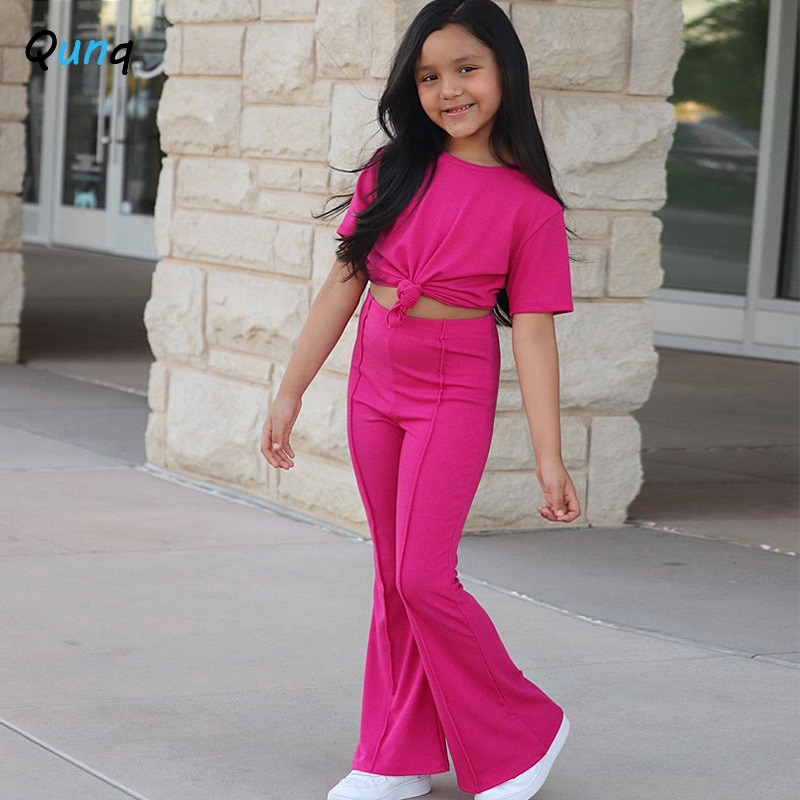 Qunq летний однотонный топ с круглым вырезом для девочек с коротким рукавом + штаны с колокольчиками комплект из 2 предметов Повседневный стиль модная детская одежда для возраста