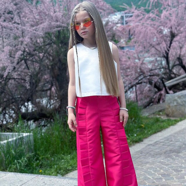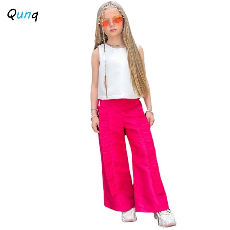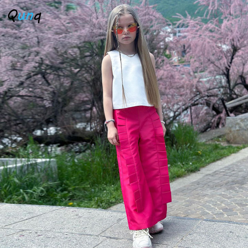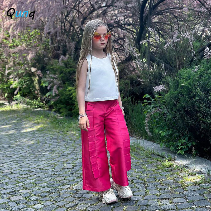 Qunq, Новинка лета 2023, однотонный жилет для девочек + атласные прямые брюки, комплект из 2 предметов, уличная мода, повседневная детская одежда для возраста