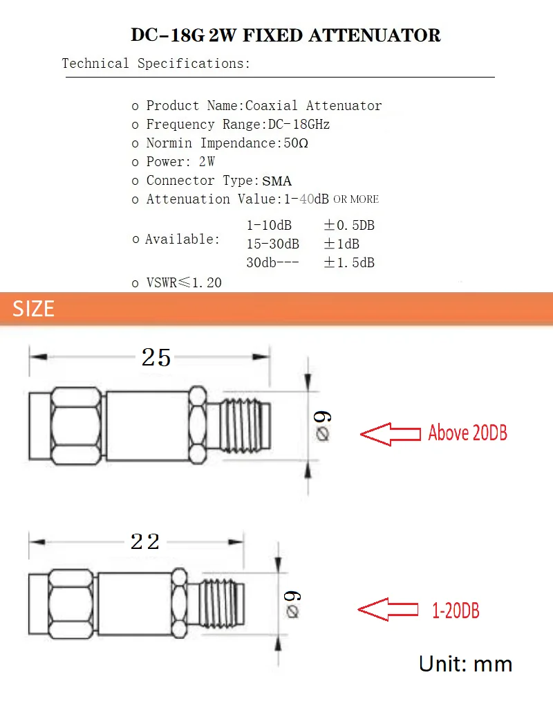 Радиочастотный аттенюатор 2 Вт, 18G, 1 дБ, 2 дБ, 3 дБ, 5 дБ, 6 дБ, 10 дБ, 15 дБ, 20 дБ, 30 дБ, 18 ГГц