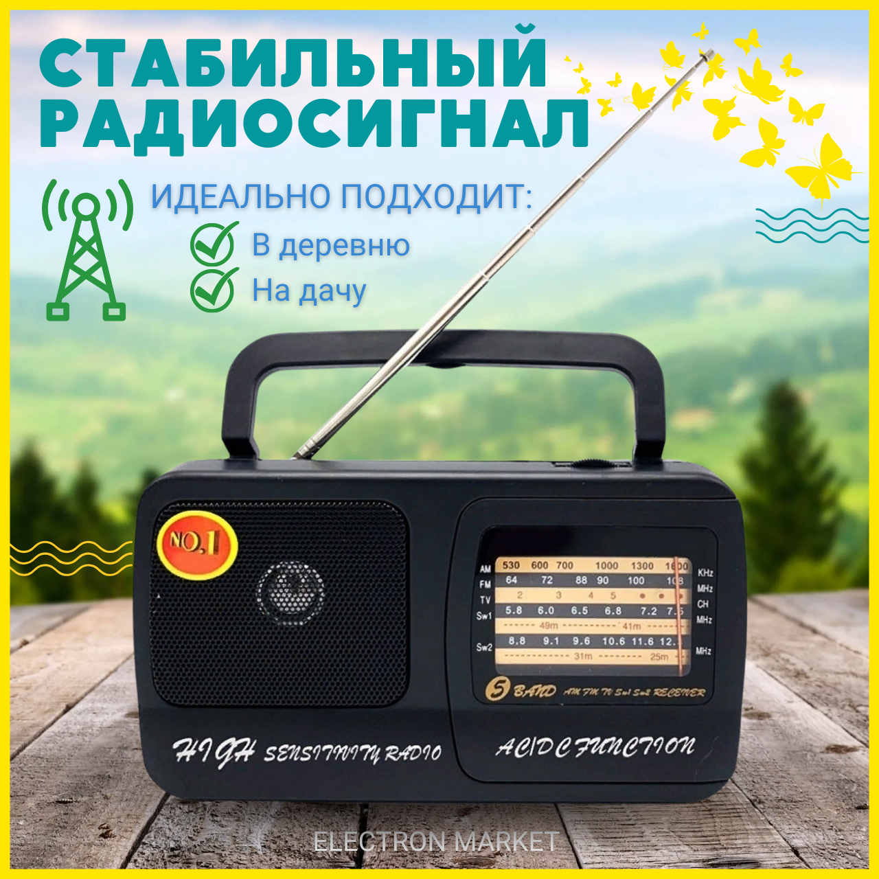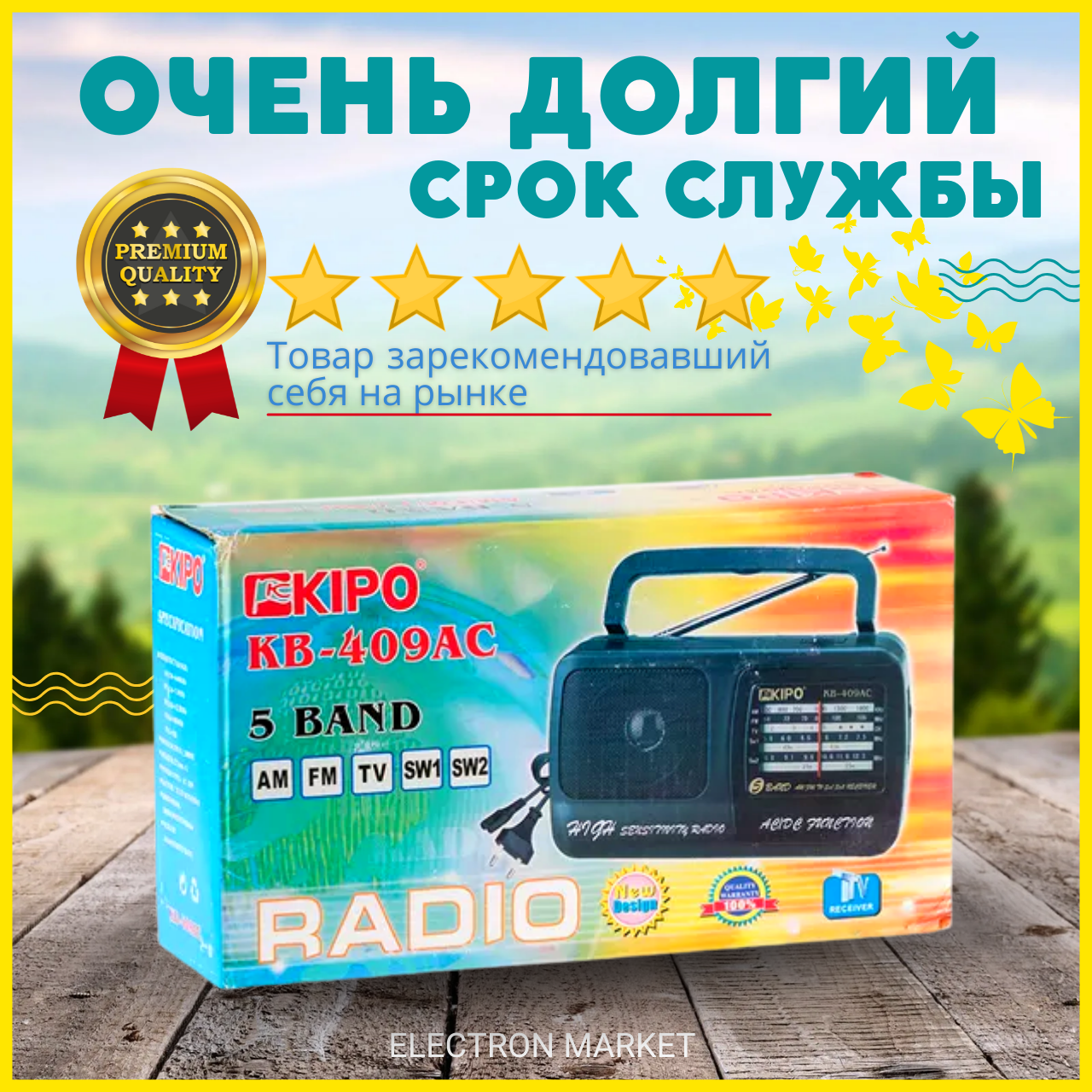 Радиоприёмник Kipo KB-409 ACКомпактные размеры, хорошее звучание, автономное питание, телескопическая антенна, приятный дизайн. Отличное качество.5-ти волновой Радиоприемник: AM/FM/TV/SW1-2 — диапазоныОсновные параметры: частотный диапазон:AM: 530-1600 кГцFM: 64-108 МГцTV: 2-5SW1: 5,8 ― 7,5 МГцSW2: 8,8-12,3 МГцБатарея: 2 х 1,5 В Размер R20 (373)Выход на наушники 3,5 ммРазмеры 115х210х60 ммВес 515 г (без батареек)Питание: от сети 220ВТелескопическая антенна, Откидная ручка.Комплектация: радиоприемник Kipo KB-409 AC, шнур питания 220v, инструкция