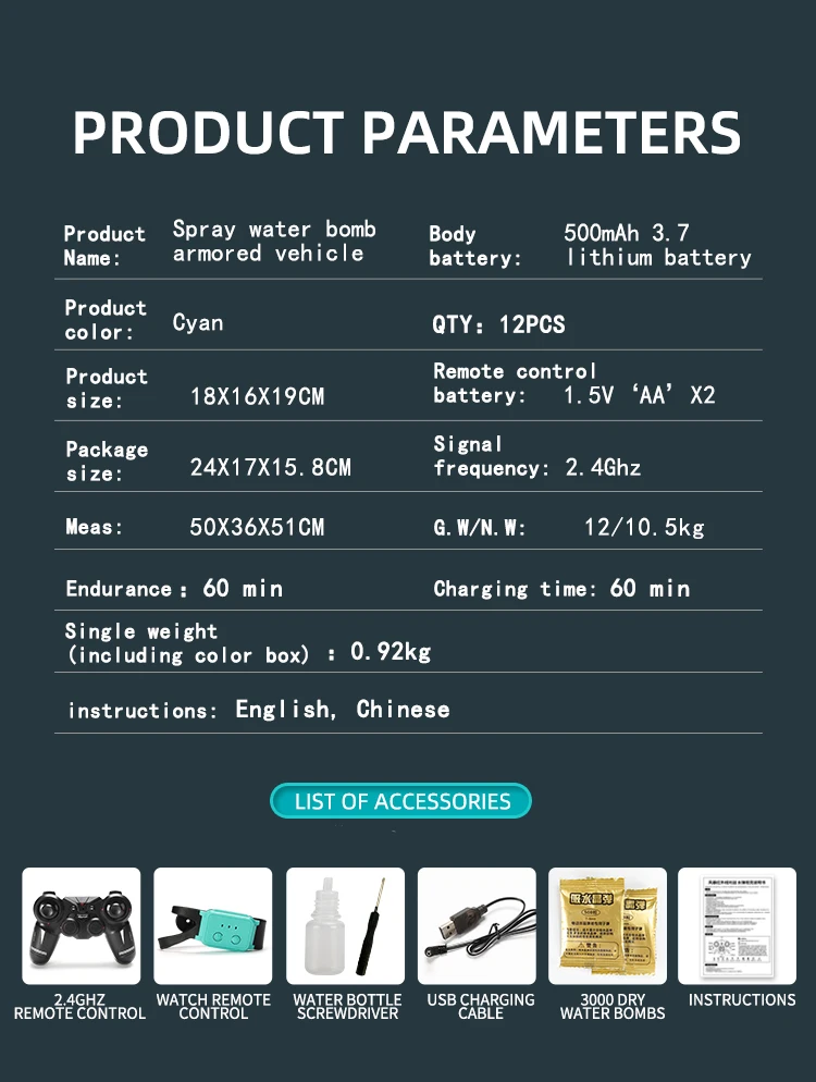 УПРАВЛЕНИЕ 2,4 GHZREMOTE, ПУЛЬТ ДИСТАНЦИОННОГО УПРАВЛЕНИЯ ЧАСами, БУТЫЛКА С ВОДОЙ, 3000 БОМБ СУХОЙ ВОДЫ, ЗАРЯДКА USB, ИНСТРУКЦИИ, ОТВЕРТКА