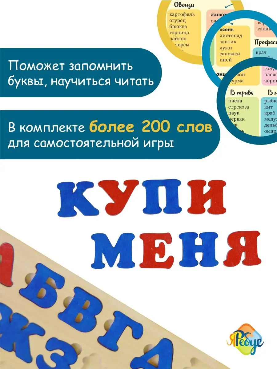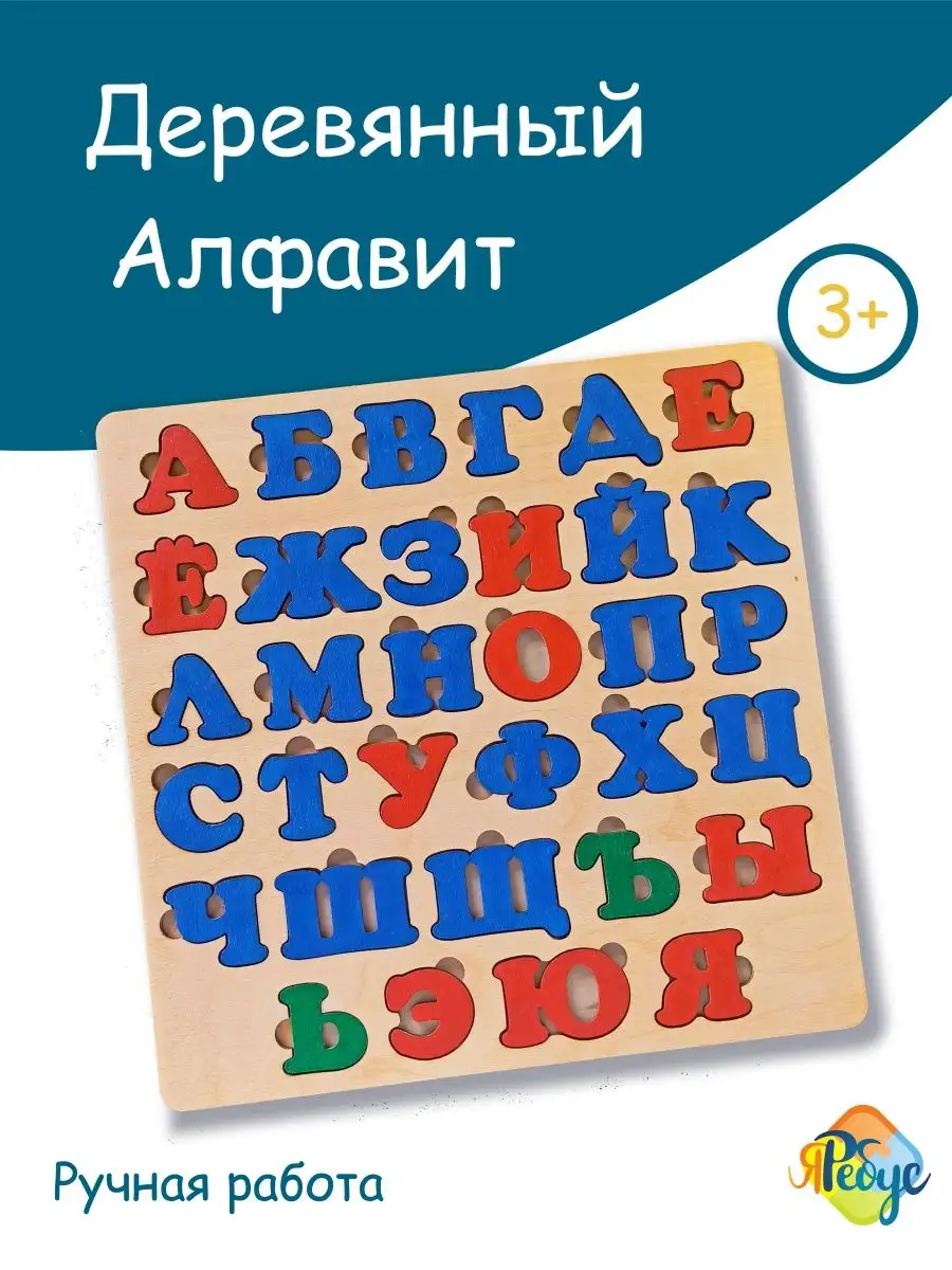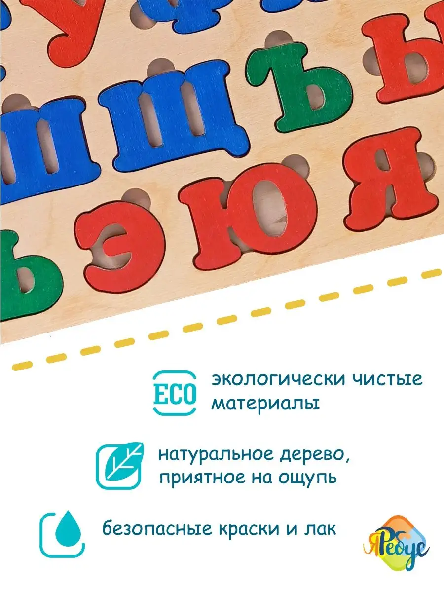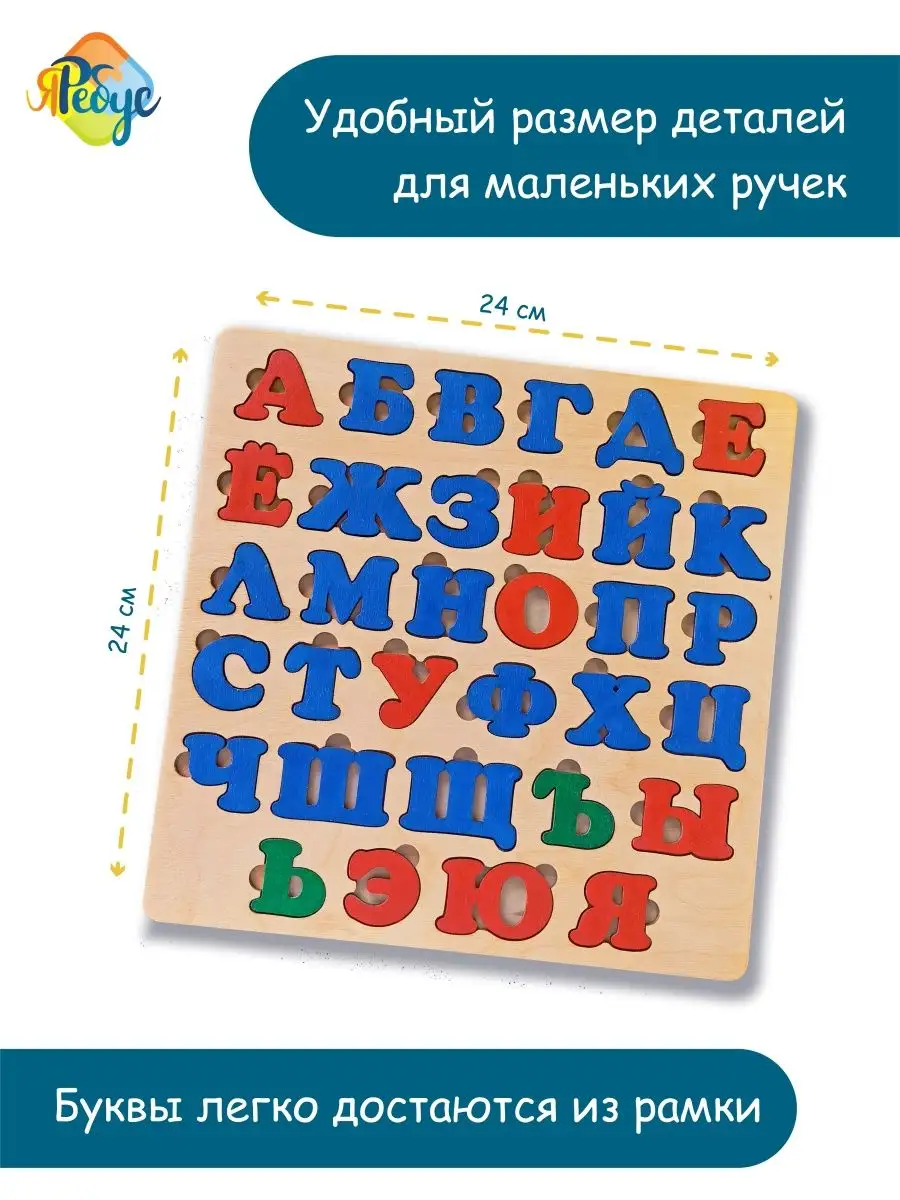 Комплектация рамка вкладыш деревянная 1 шт; 33 буквы русского языка; пособие со словами без повторов букв; пазлы для малышей; деревянные игрушки