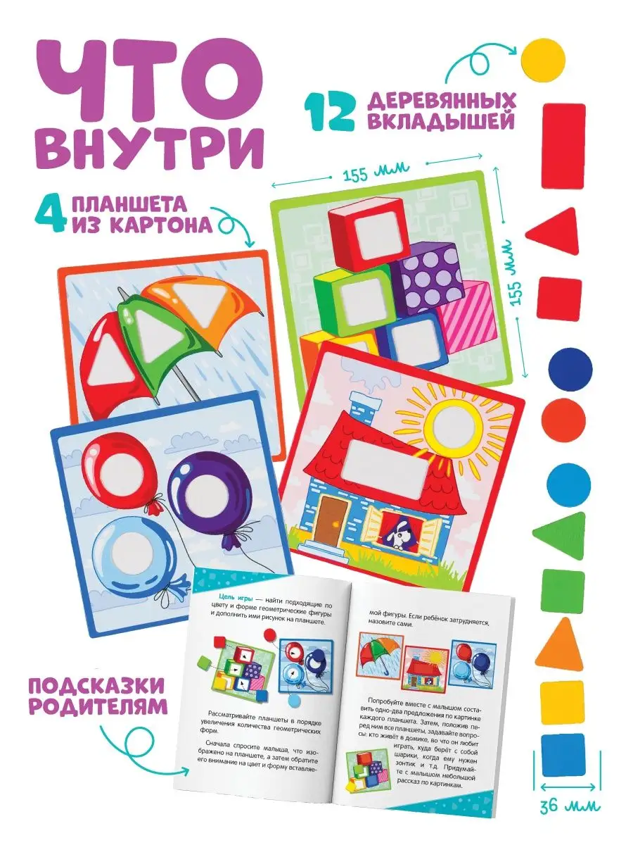 Комплектация Прочная и удобная коробка для хранения игры - 1 шт; планшет-рамка для деревянных вкладышей - 4 шт; деревянные вкладыши - 12 шт; Инструкция для родителей - 1 шт