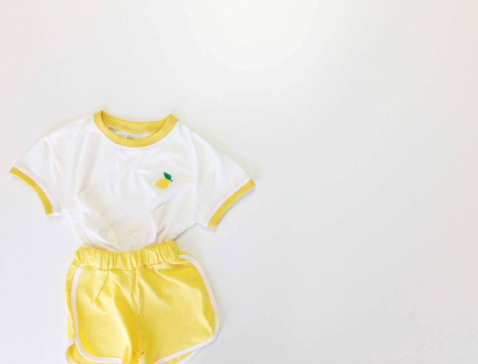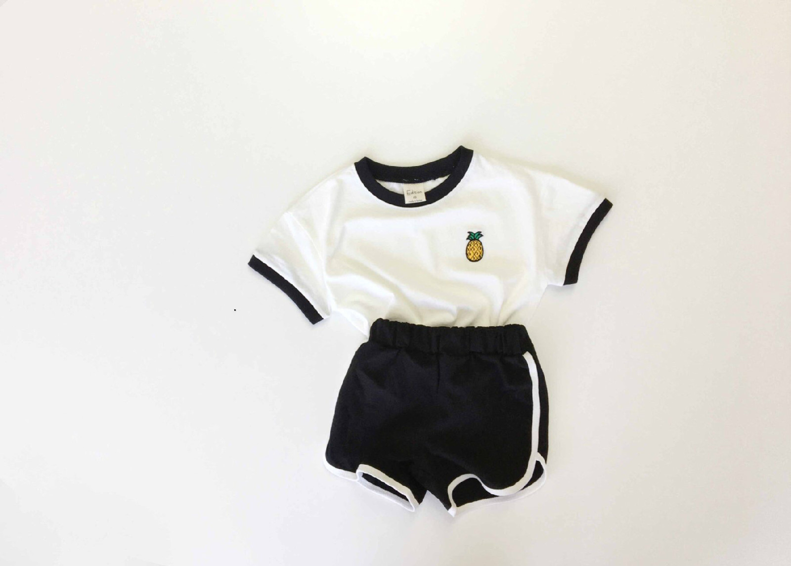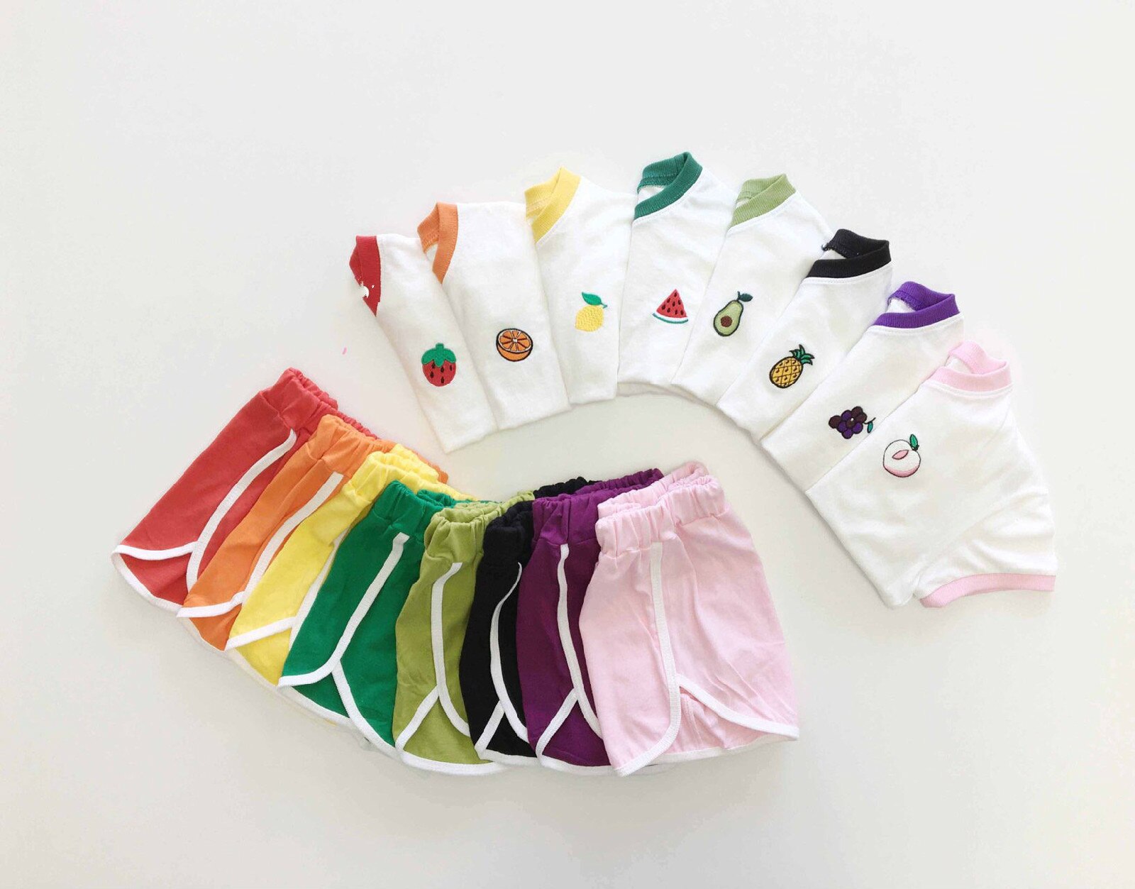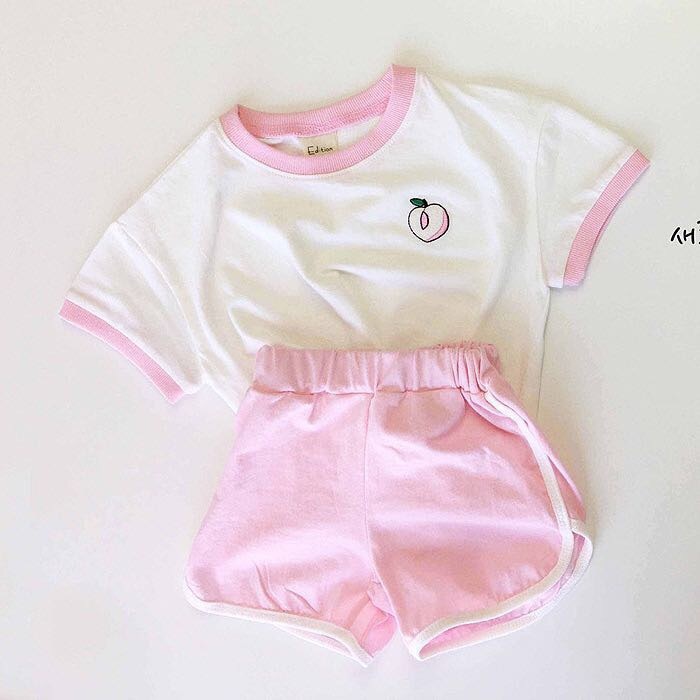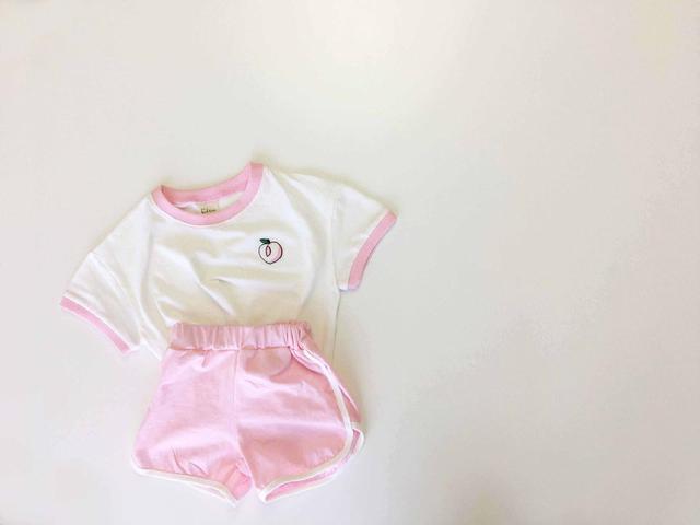 Распродажа со склада 7654, комплект детской одежды, корейский летний костюм для мальчиков, милый костюм для маленьких девочек с фруктовым узором, костюм из 2 предметов, футболка + шорты