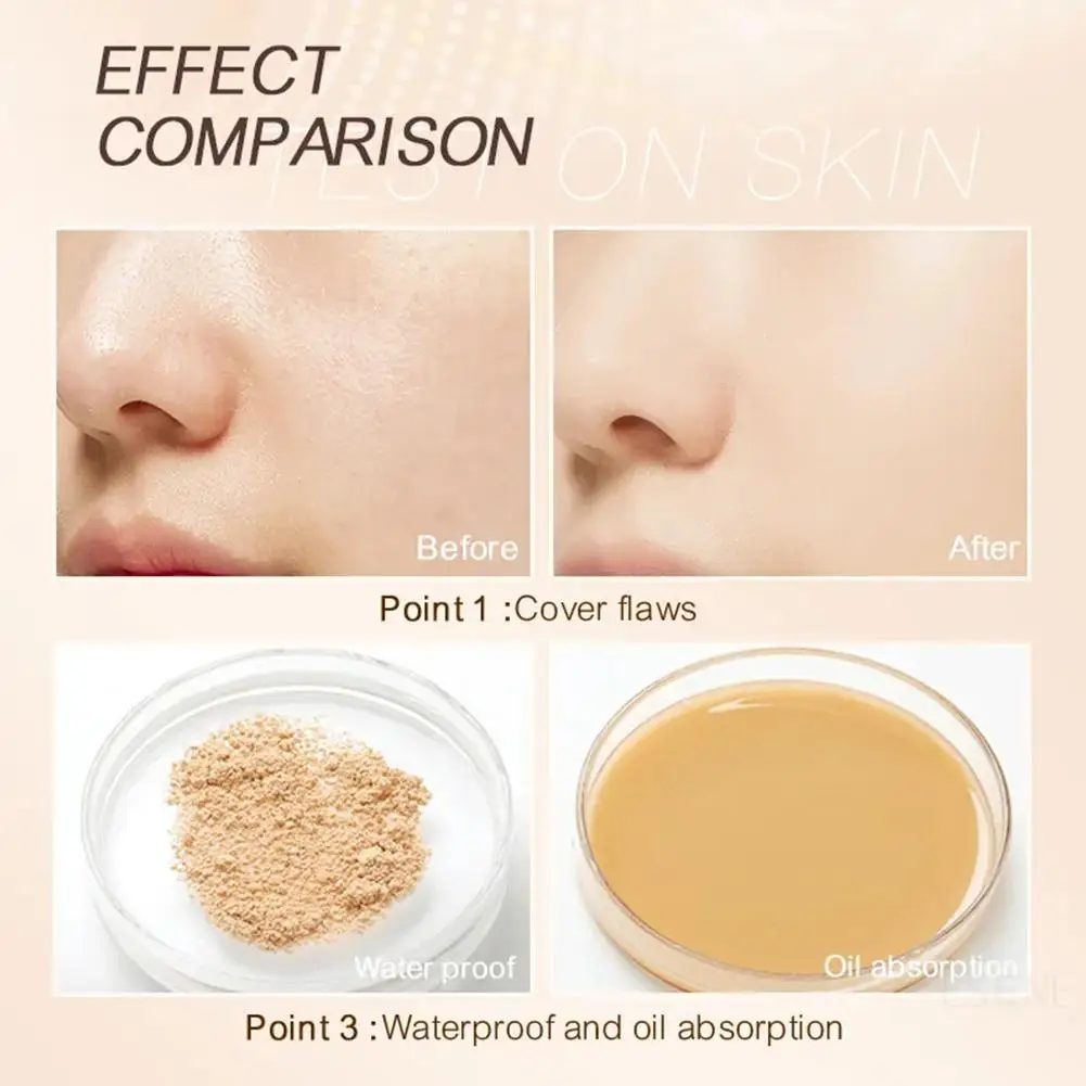 4. Водонепроницаемый, не плавающий порошок, не легко удаляет макияж, стойкий эффект макияжа, естественно осветляет цвет кожи.