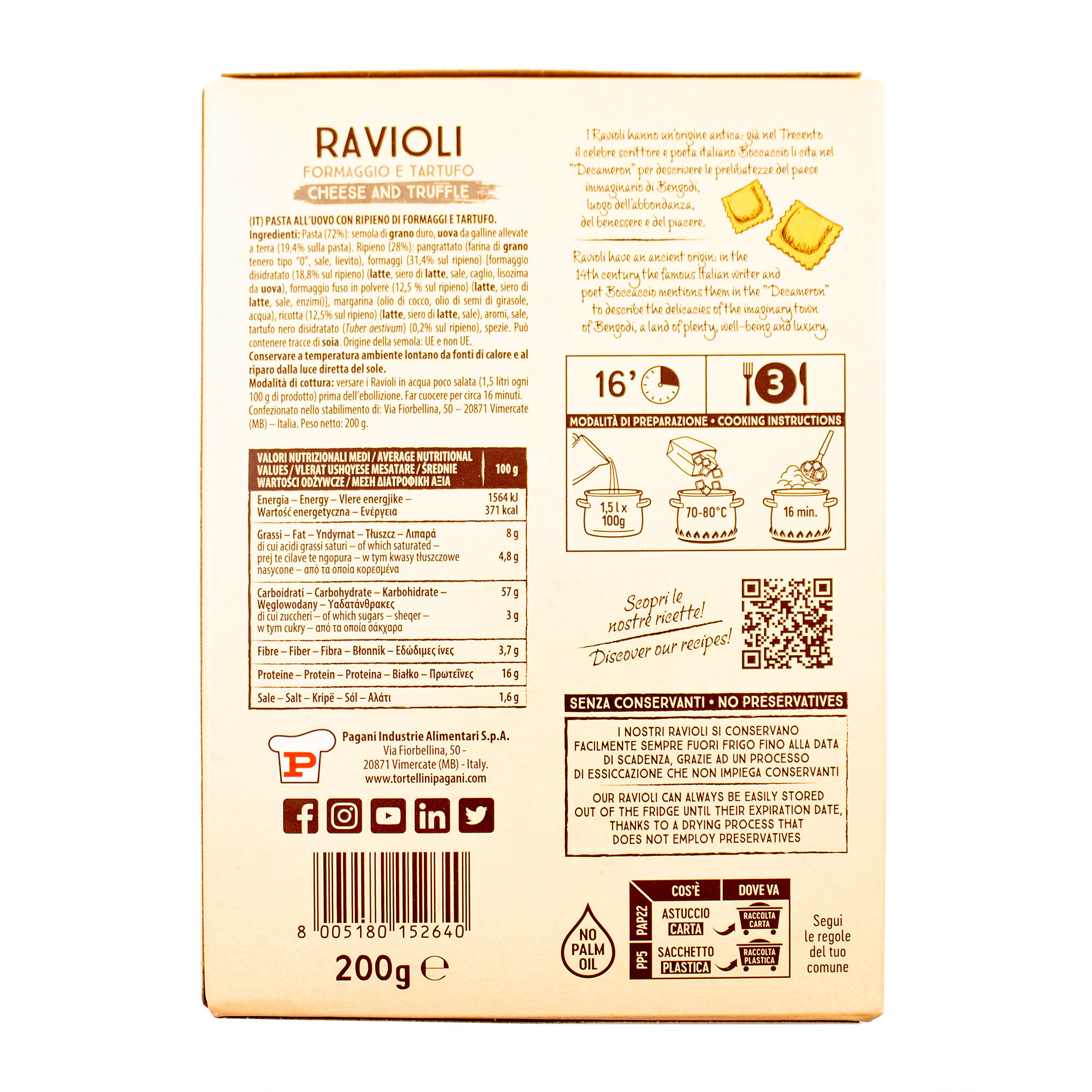 Паста 72%: мука из твердых сортов пшеницы, яйца кур свободного выгула (19,4% от пасты). Начинка 28%: панировочные сухари (мука из мягких сортов пшеницы типа 0, соль, дрожжи), сыры (31,4% от начинки) [сыр обезвоженный (18,8% от начинки) (молоко, сыворотка молочная, соль, сычужный фермент, яичная лизоцима), сыр смолотый в порошок (12,5% от начинки) (молоко, сыворотка молочная, соль, ферменты)], маргарин (масло кокосовое, масло подсолнечное, вода), сыр рикотта (12,5% от начинки) (молоко, сыворотка молочная, соль), ароматизаторы, солдь, трюфель черный сушеный (Tuber aestivum) (0,2% от начинки), специи. Может содержать остатки сои.