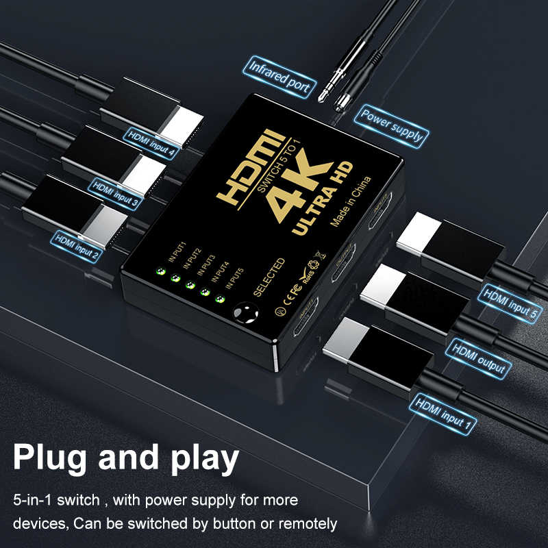 Разветвитель 4K HDMI 5 в 1, 5 портов, 1x5, HDMI переключатель, видеораспределитель, разветвитель для PS3/4/5, Xbox, ТВ, ПК, ноутбука, монитора, проектора