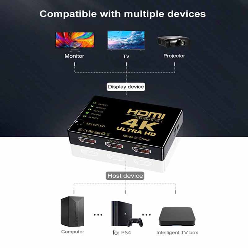 ● Высокоскоростной переключатель HDMI 5x1 4K x 2K. Используйте этот переключатель HD для подключения игровых консолей, ноутбуков, настольных компьютеров и других устройств, совместимых с HDMI, к телевизору высокой четкости.