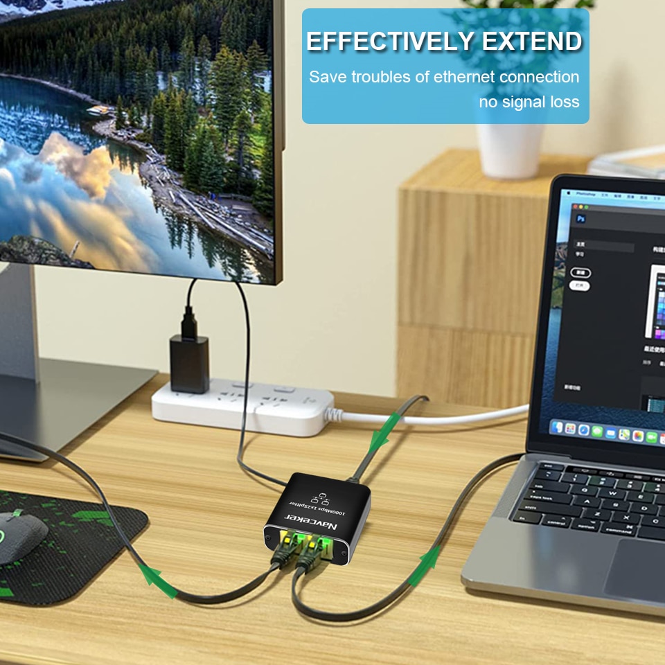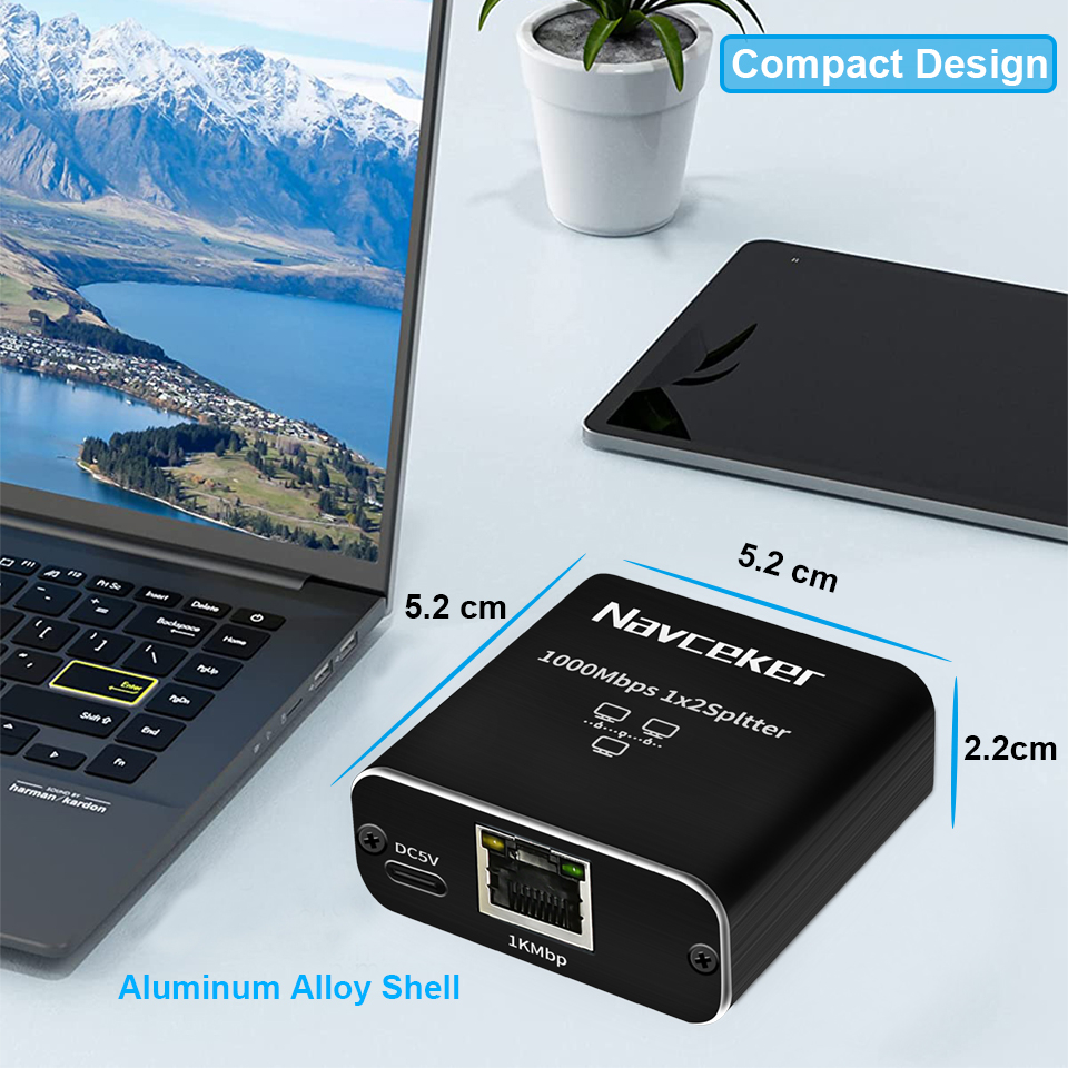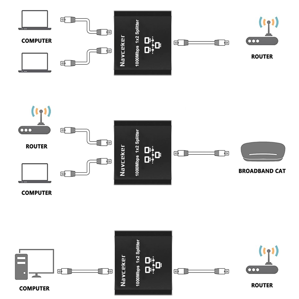 ZY-AW3,Navceker 1x2 Ethernet Gigabit Splitter Позволяет одному маршрутизатору/коммутатору Ethernet одновременно подавать два сигнала сети Ethernet 1000 Мбит/с в разных комнатах, без необходимости тянуть кабель из другой комнаты в комнату для подключения к этому компьютеру.