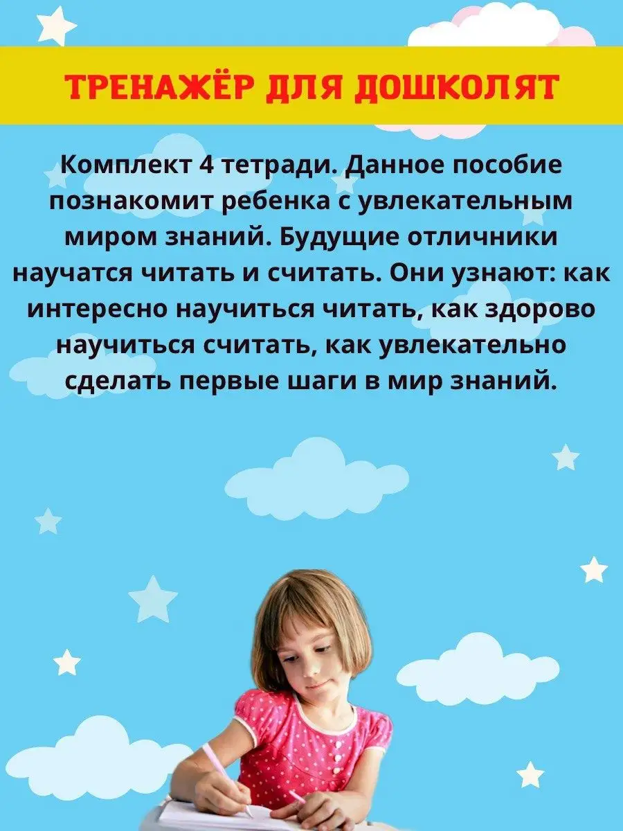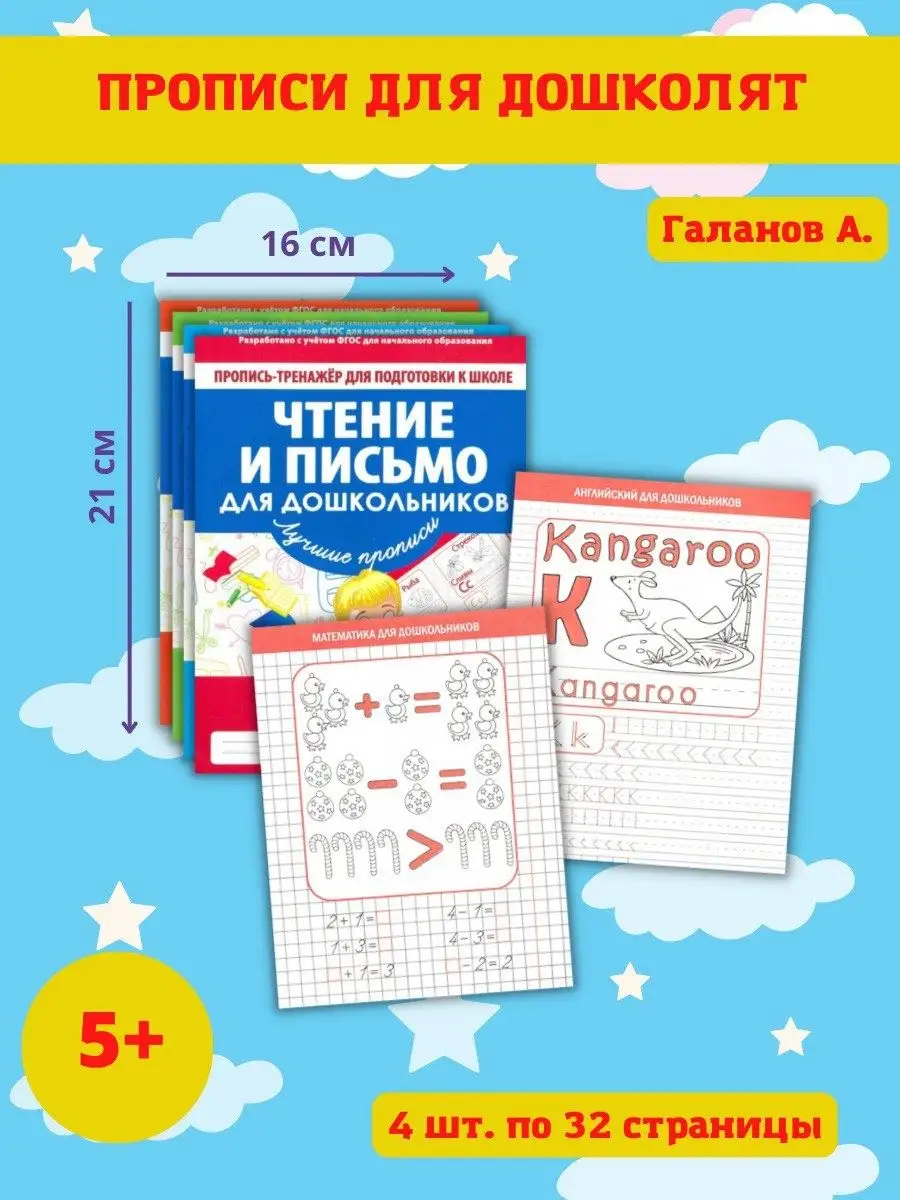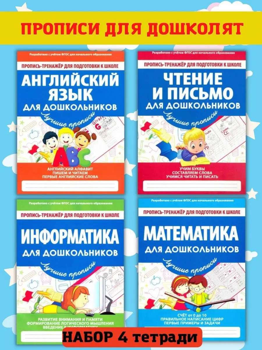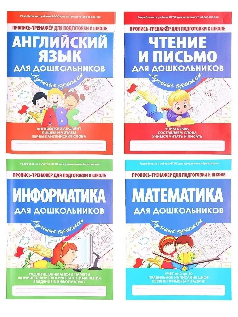 Описание: Набор 4 книги. Пропись-тренажер для подготовки к школе.Для детей дошкольного возраста.Информатика для дошкольников.Математика для дошкольников.Чтение и письмо для дошкольников.Английский язык для дошкольников.