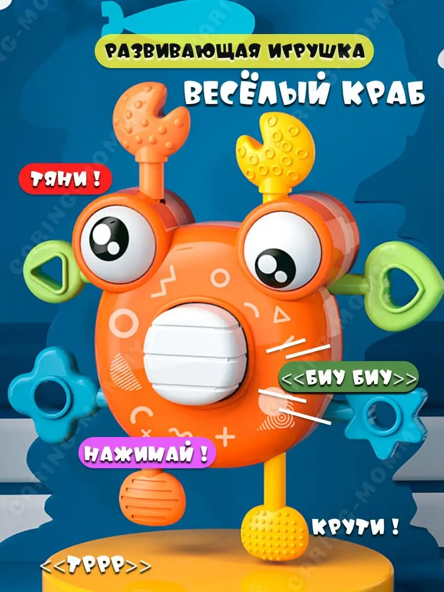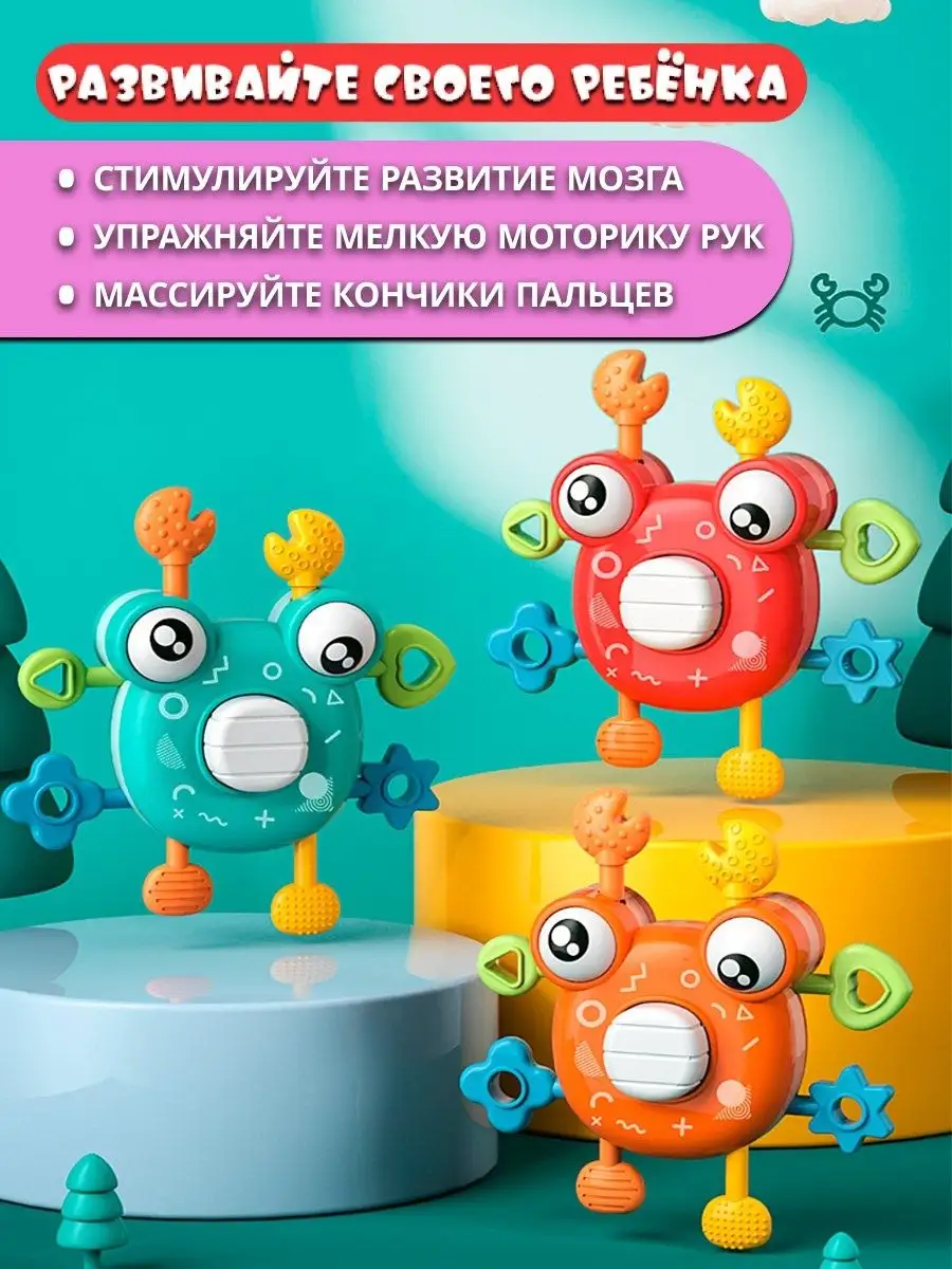 Описание: "Весёлый краб" с устройством пищалка и рельефными ножками - это маленькая, но уникальная игрушка для раннего развития! Легкая и небольшая развивашка монтессори выполнена из пластика и силикона и безопасна для детей от года. Маленькие пальчики годовалых мальчиков и девочек с удовольствием играют с трещащими массажными щупальцами шариками краба, имеющими различный рельеф. Трещотки в ножках будут трещать при каждом движении, что поможет настроить сенсорику и тактильную чувствительность ребенка. Устройство пищалка, расположенное внутри, позволяет производить звуки при нажатии на краба. Это не только увлекательное развлечение для детей, но развивающая пальчиковая игра - отличный способ тонко настраивать мелкую моторику, логику, координацию движений, ловкость рук и реакцию у детей. Крабик привлекает и удерживает внимание, снимает стресс и успокаивает. Использование сенсорных игрушек рекомендуется логопедами и психологами, начиная с 6 месяцев, так как развитие моторики помогает запустить речь. Для ребенка 1-2 лет неоходимы игрушки, производящие различные звуки и имитации. Интерактивные функции игры - неплохой инструмент для обучения дикции, наработки голоса и образования слов для детей в возрасте от 1,5 лет до 3 лет и старше. Монтессори игрушки для малышей обеспечивают также развитие мозга. Этот новый бизиборд - прекрасный выбор для тех, кто ищет интересный способ помочь своему ребенку научиться разным навыкам, он снимет напряжение и привлечет внимание. Используйте краба для игр на дому, в прогулке или в дороге, берите в гости, на праздник, в детский сад! Как и большинство игрушек от 6+, крабик - это отличный подарок для малыша на первый день рождения, на 1 годик или на 2 девочке или мальчику, 1 развивашки станет приятным украшением детской комнаты, привнесет больше удовольствия и радости в жизнь крохи. Подарки для детей - это всегда здорово, особенно если они полезные и интересные! Проверенное качество! Товар сертифицирован в соответствии с требованиями санитарно-гигиенических норм российской Федерации и Евразийского экономического союза.