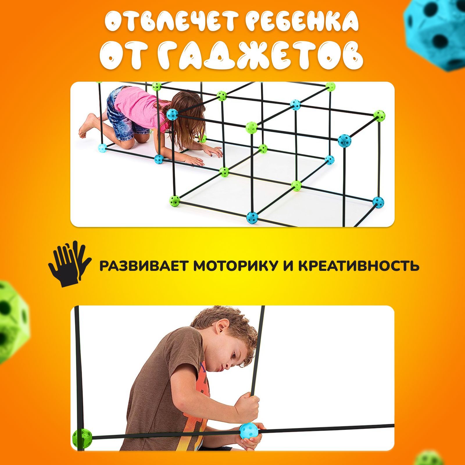 Описание: Большой конструктор для творчества в полный рост! В наборе 77 деталей для постройки домиков и палаток. Стройте самые разнообразные конструкции: дом, тоннель, шалаш, палатку, ракету, вигвам, замок и пр. Палочки плотно вставляются в шары из специального материала и хорошо держат форму. Это самая прочная модель конструктора для постройки домиков. Накройте постройку легким покрывалом (не входит в набор) – и настоящее секретное укрытие готово!
