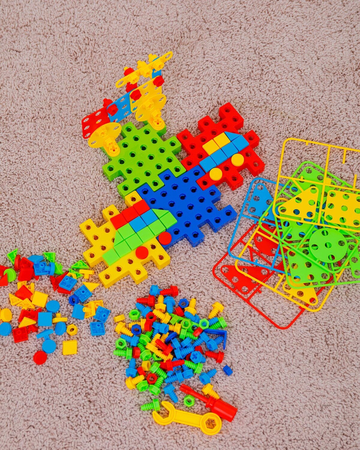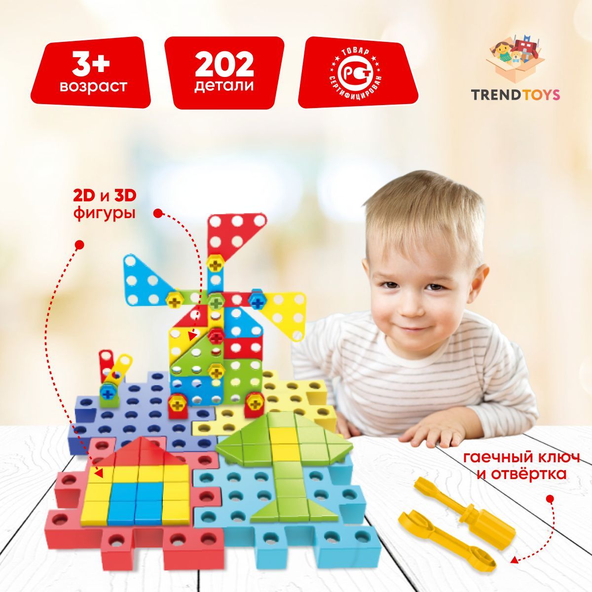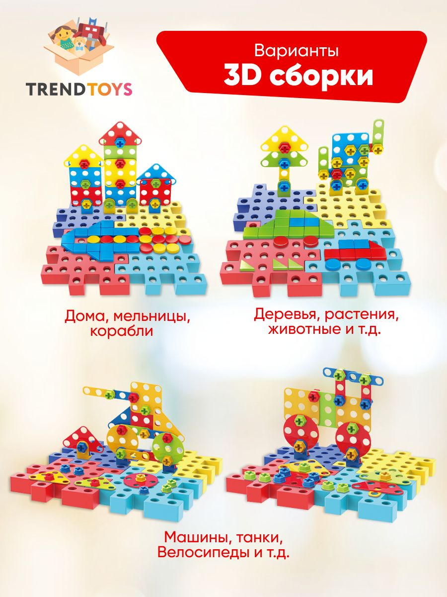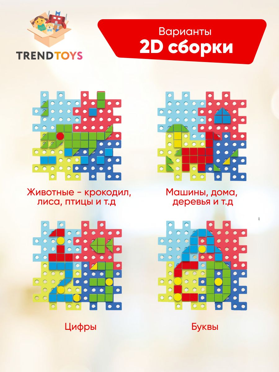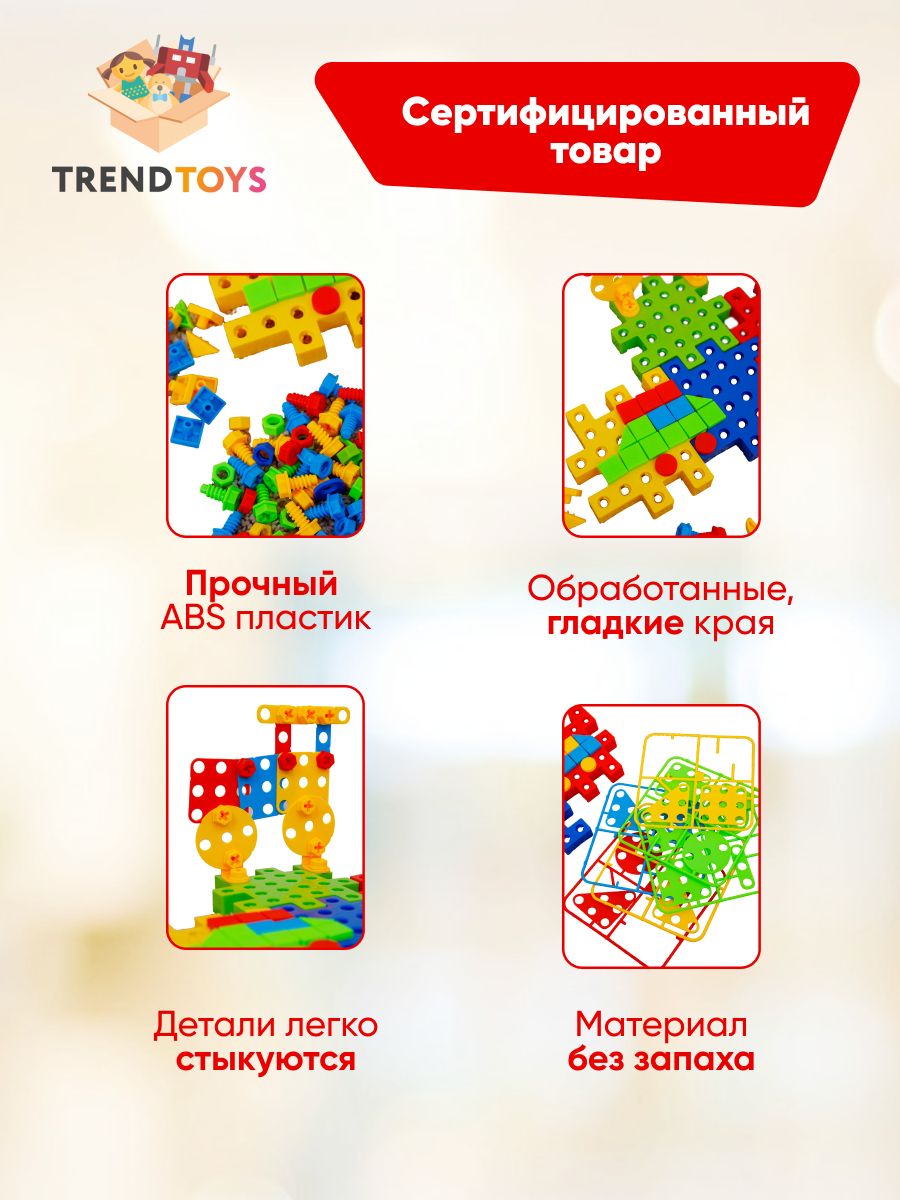 В комплект входит 202 детали, в том числе : 4 основы для конструктора , 28 деталей для крепления, 1 отвертка , 1 разводной ключ,35 гаек, 60 болтов, 72 элемента мозаики . Вес: 0,47 кг .  Товар соответствует требованиям безопасности ТР ТС 008/2011.