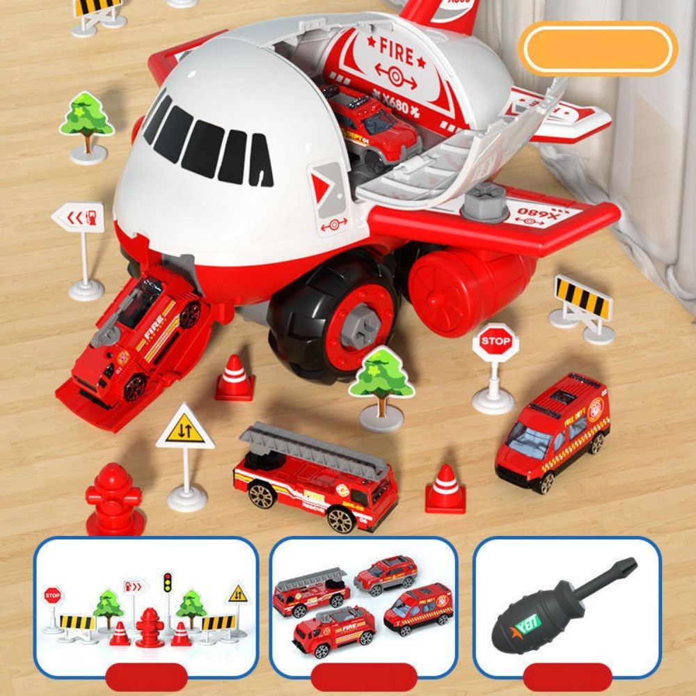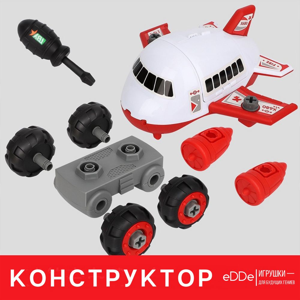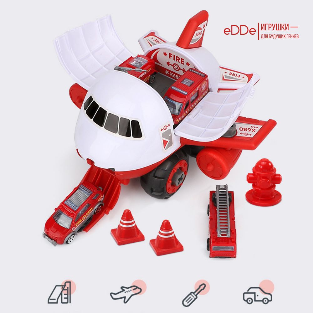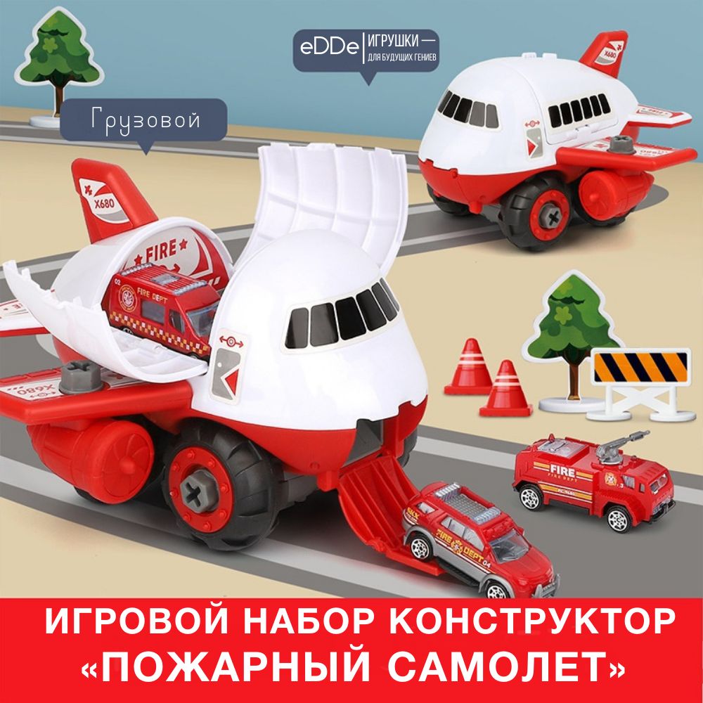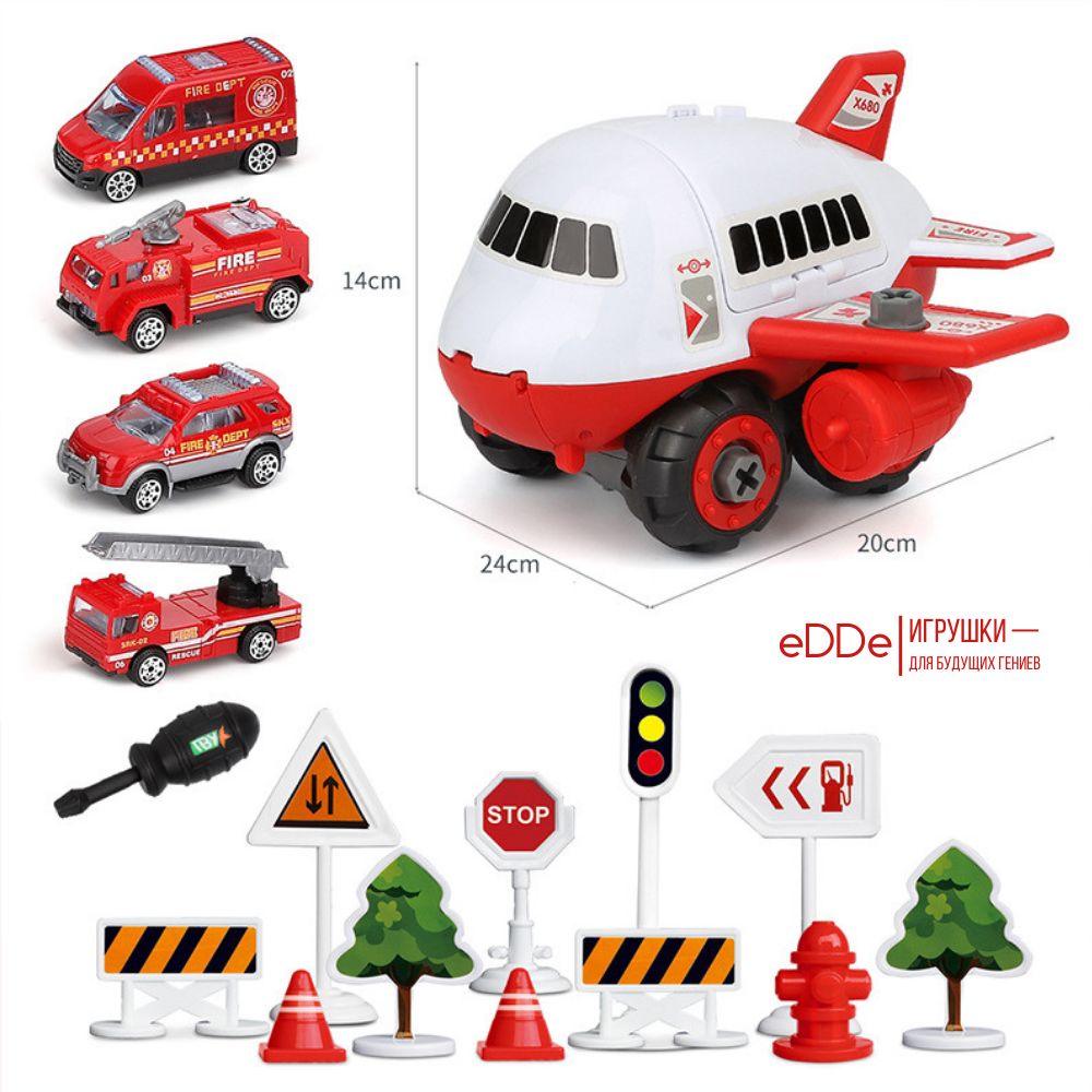Развивающий игровой набор конструктор «Пожарный самолет» с игровым полем Город и 4 металлическими машинками. Самолёт с машинками, отвёрткой, дорожными знаками в составе также является многофункциональной игрушкой. Шурупы имеют большой размер, что идеально подходит для детей. Во время сборки и разборки самолета у ребёнка развивается мелкая моторика, логика и навыки конструирования.