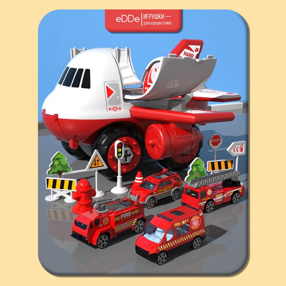 Развивающий игровой набор конструктор Пожарный самолет / В комплекте 4 металлические машинки, дорожные знаки и игровое поле Город / Подарок ребенку