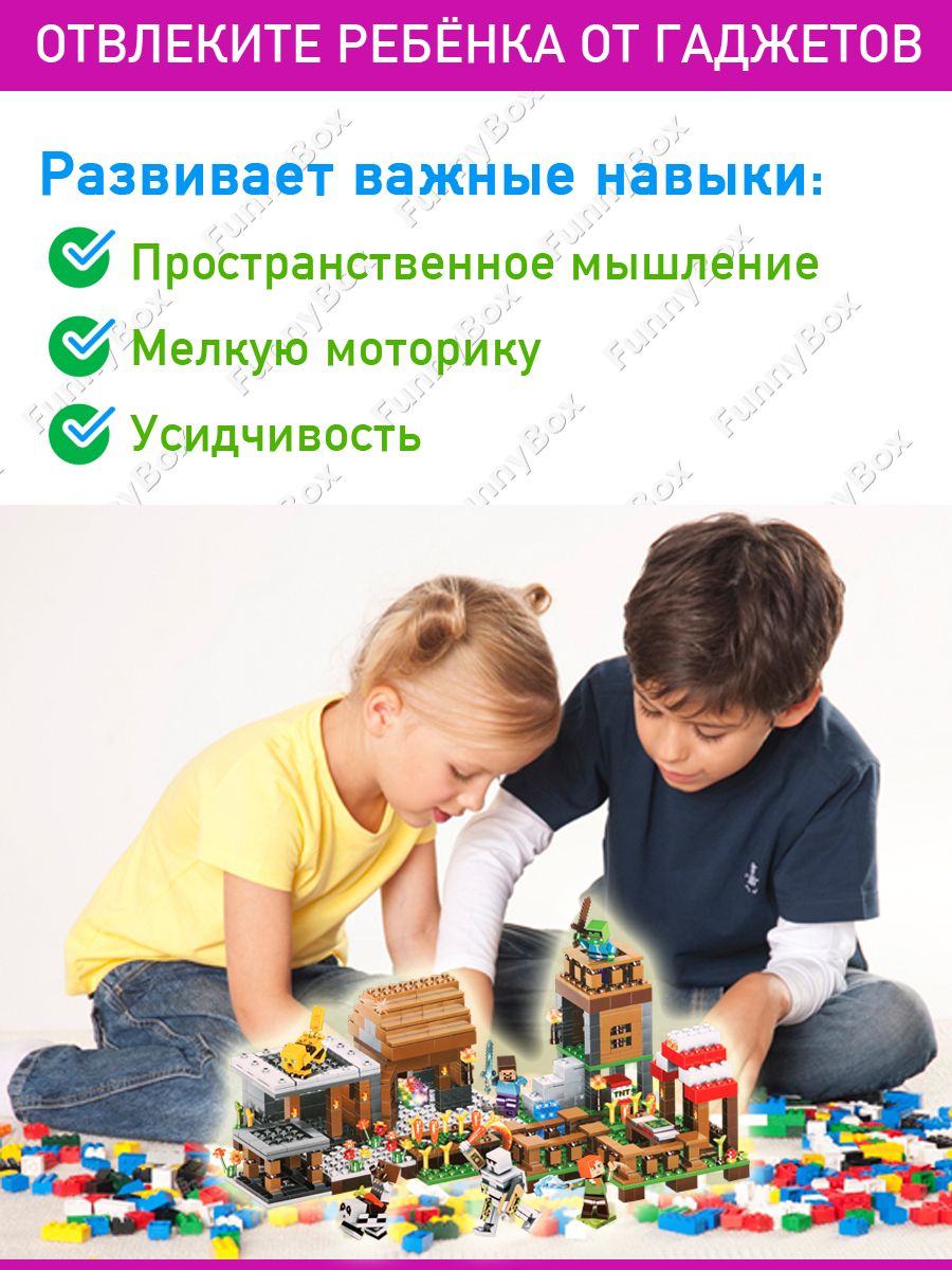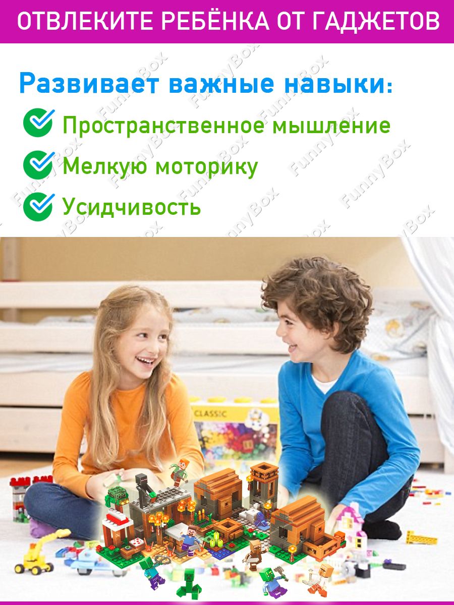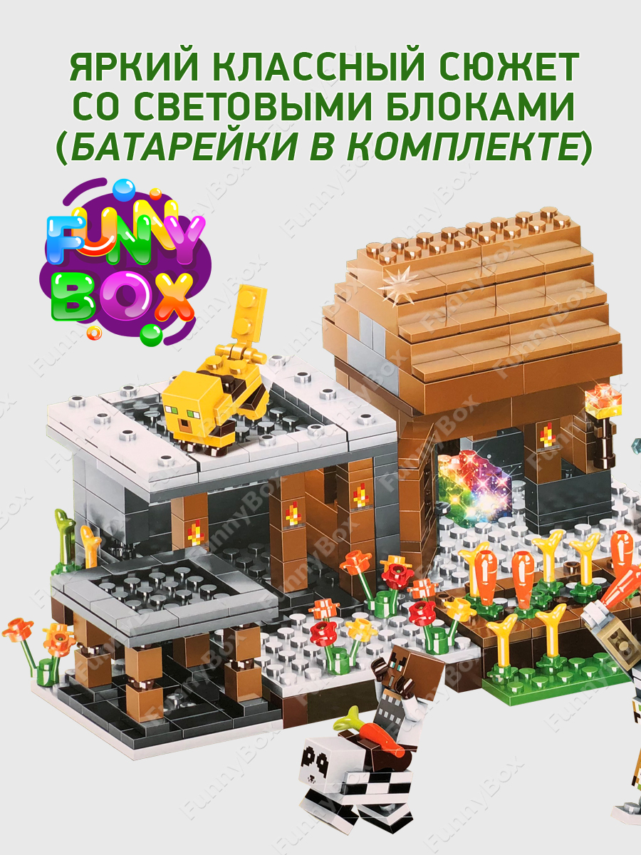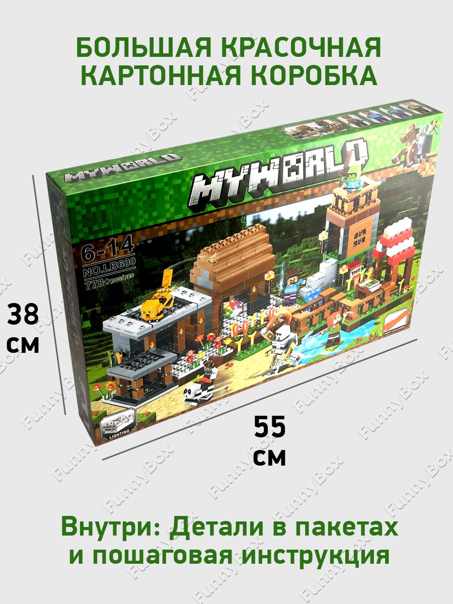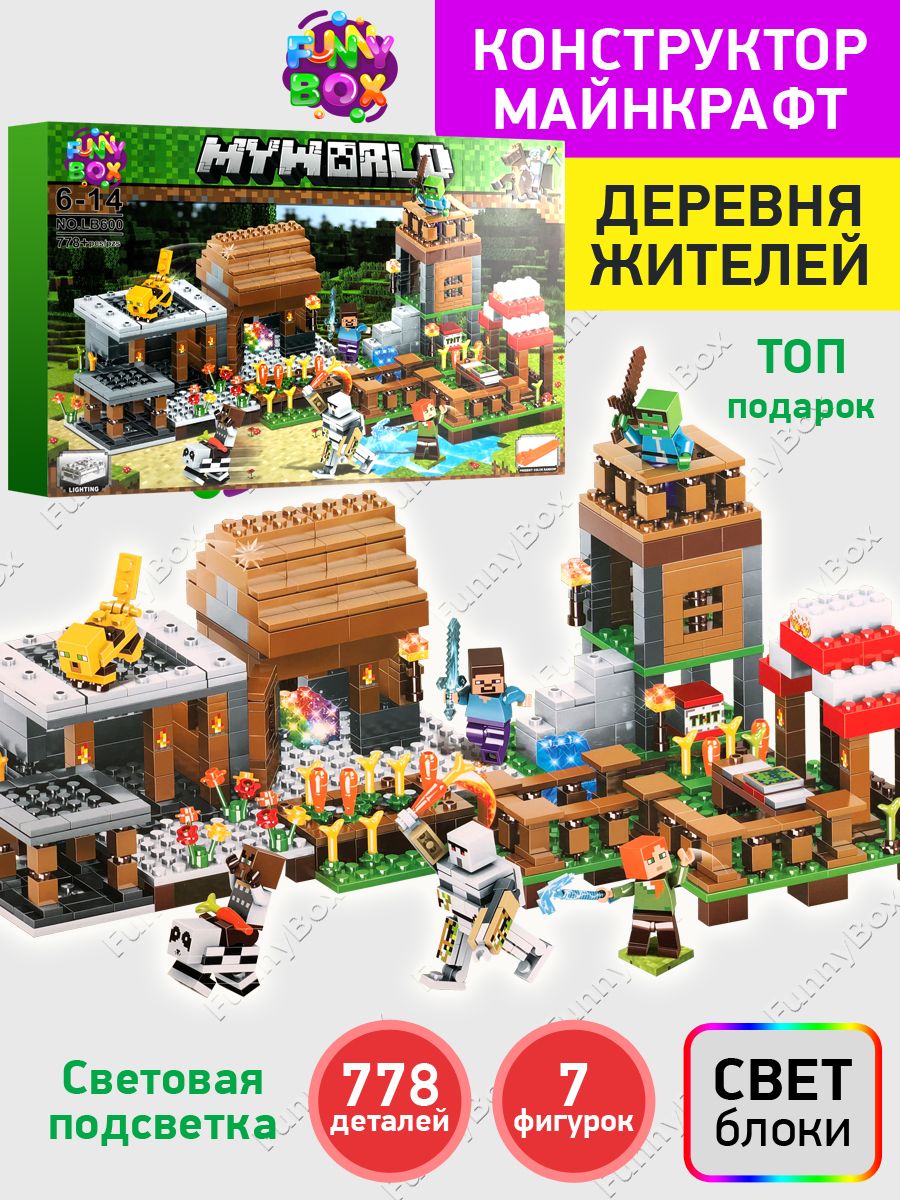 Развивающий конструктор Майнкрафт Деревня с фермой, со световым элементом LED-подсветка, набор 778 деталей 7 фигурок, совместим с лего