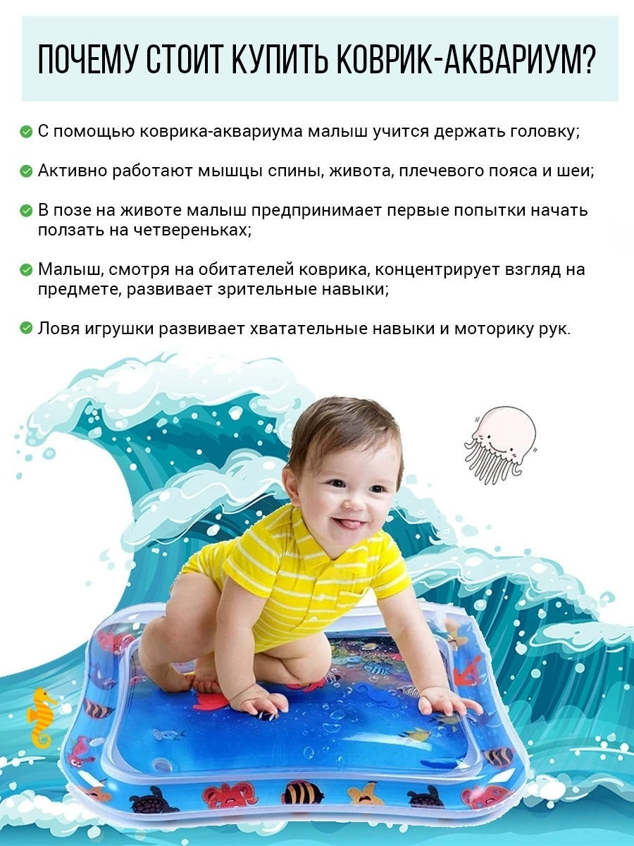 Развивающий водный коврик развивает интеллект и воображение ребенка! Играя, ребенок развивает мелкую моторику, тактильные навыки и концентрацию внимания, а также укрепляет мышцы рук, ног, спины и шеи. Также это профилактика синдрома "плоского затылка". Во время игры с плавающими фигурками ребенок формирует пространственное мышление. Для ребенка данный коврик - это замечательная игра, которая приносит ему множество положительных эмоций и радости. Купив ребенку развивающий водный коврик, вы не только подарите ему незабываемые эмоции, но также поможете ему в развитии. Подходит для детей от 3-х месяцев. ВАЖНО! Перед использованием коврик тщательно промыть моющим средством и проветрить. Также обратите внимание, что коврик оснащен клапаном для защиты от сдувания. Поэтому при надувании коврика зажмите клапан, чтобы он сплющился, для свободного поступления воздуха внутрь изделия.
