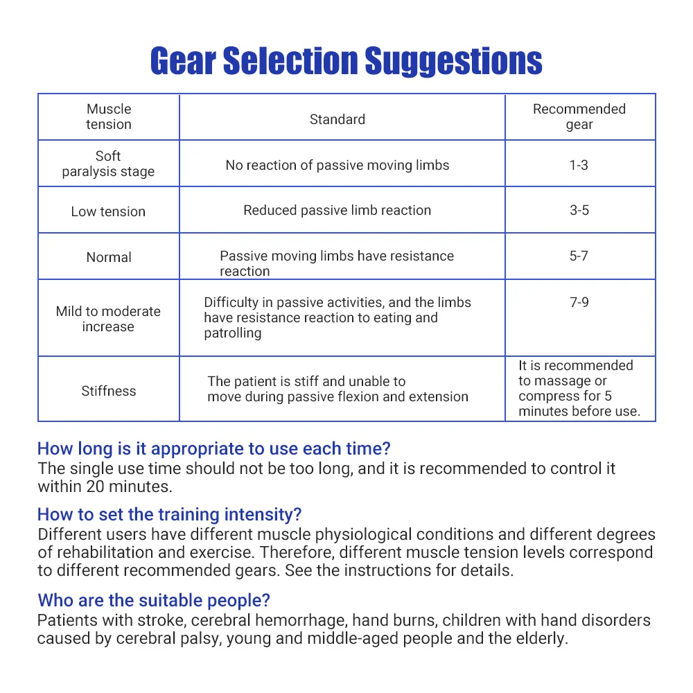 У разных пользователей разные физиологические состояния мышц и разная степень реабилитации и физических упражнений. Таким образом, разные уровни мышечного напряжения соответствуют разным рекомендуемым передачами. Смотрите инструкцию для деталей.