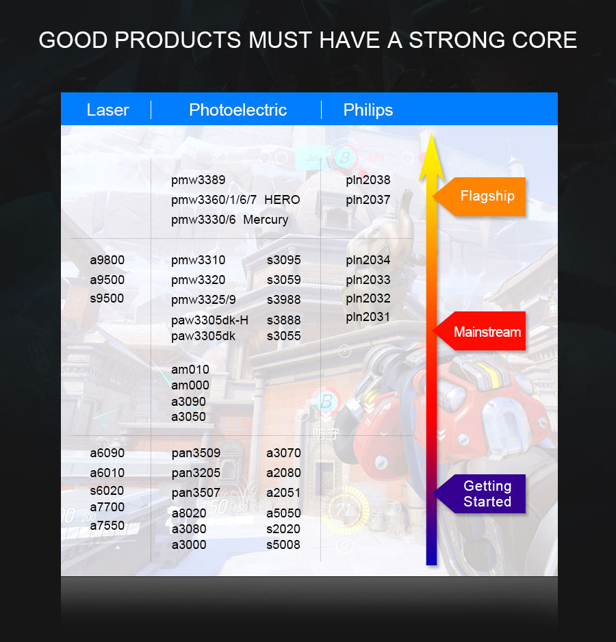 THE CORE MODEL OF OUR MOUSE IS P3327,WHICH IS BEST CORE; 220IPS;125/250/500/1000HZ polling rate;