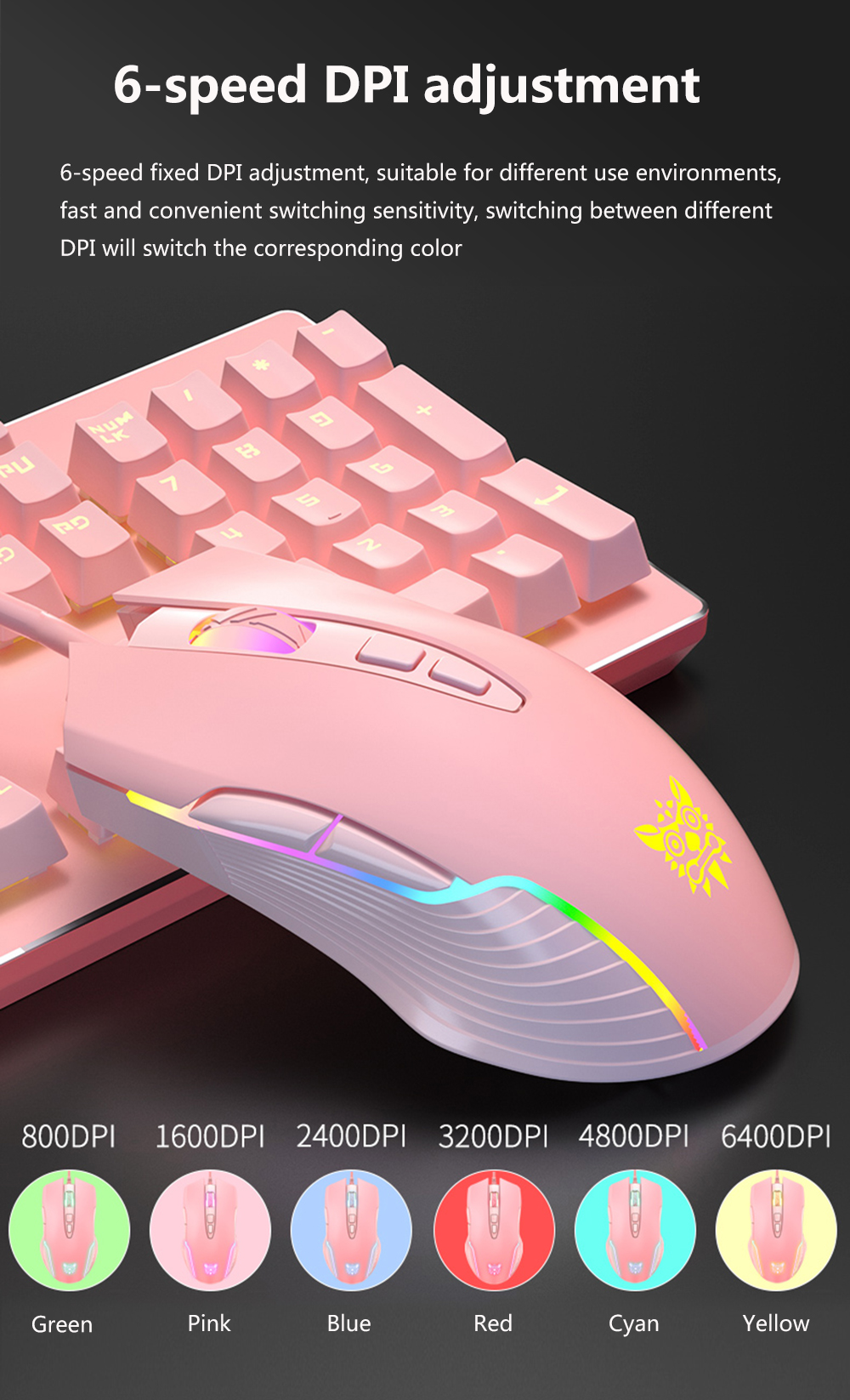 Регулируемая оптическая мышь, 6 скоростей DPI, 6400DPI, 7-кнопочная светильник ка, подходит для ПК, ноутбуков и геймеров