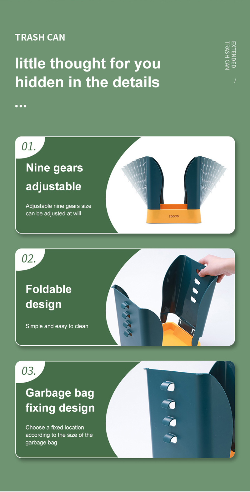 2,Expandable Design: This garbage bag holder is expandable, with a nine-speed opening and closing design, the size of the garbage bag can be adjusted at will, which is very practical.