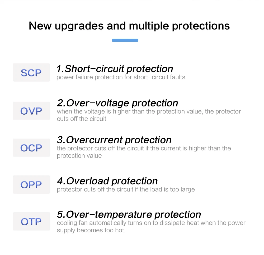 6. Он имеет защиту от перенапряжения (OVP), защиту от перегрузки по току (OCP), защиту от перегрева