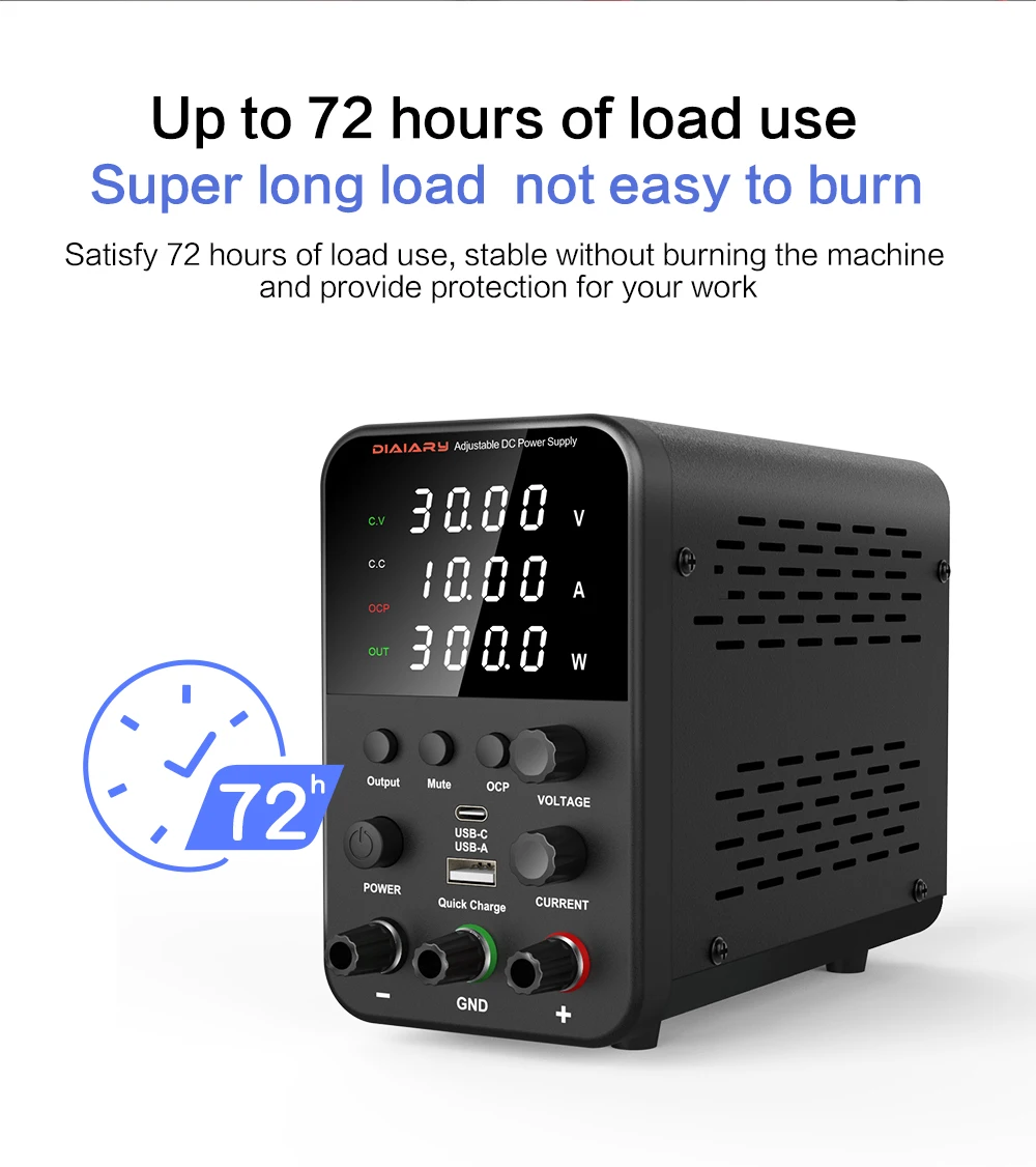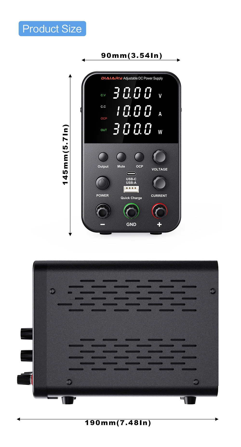 Продукты новой серии DIAIARY. Эта модель представляет собой миниатюрный импульсный источник питания постоянного тока. Выходное напряжение и ток можно контролировать и регулировать с помощью переменных резисторов соответственно, что обеспечивает больше удобства и точности при регулировке напряжения и тока. Панель также обеспечивает высокоточное двух/трехоконное Цифровое Отображение напряжения, тока и мощности, так что пользователи могут интуитивно видеть текущий статус использования и различные параметры машины.