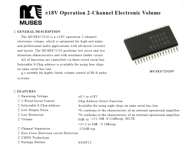 Новый чип регулировки громкости MUSES72323 компании Japan NJR, этот чип через интерфейс SPI управляет внутренним регулируемым сопротивлением для регулировки громкости, и звук проходит через чип полностью аналоговым способом без какого-либо цифрового преобразования или преобразования VI/IV, не влияя на качество звука. Этот чип имеет очень высокие DNR и SNR, очень низкие THD + W, очень точный шаг регулировки громкости, нет встроенного операционного усилителя (поэтому качество звука и производительность не будут ограничены операционным усилителем) и другие преимущества. Индекс искажения намного ниже, чем у других схем (E. г. MAS6116,PGA2310,Alps RK50,Alps RK27 и т. Д.) И должны быть примерно средними по сравнению со схемой сети сопротивления/реле R2R.