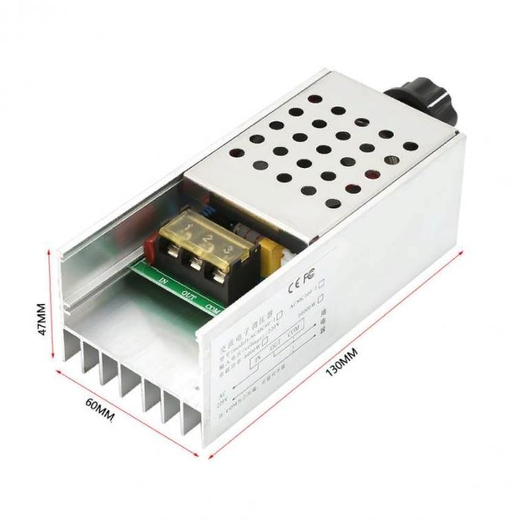 Симисторный регулятор мощности. Предназначен для работы в бытовой сети переменного тока 220 вольт 50 Гц. Мощность подключаемой нагрузки не выше 3000 ватт (пиковая, пусковая 6000Вт).Должен обеспечиваться возможностью охлаждения (открытая установка), а при мощностях, близких к максимальным, возможно, потребуется обдув. Ставится в разрыв одного питающего провода. Третий контакт (COM) может подключаться к неразрывному проводу для снижения помех и наводок согласно схеме на корпусе прибора. Может управлять яркостью ламп накаливания, нагревом ТЭНов, однофазными электродвигателями (с некоторыми ограничениями).НЕ МОЖЕТ управлять некоторыми реактивными  нагрузками (лампы-сберегайки, бытовая электроника, трансформаторы и т.п.)