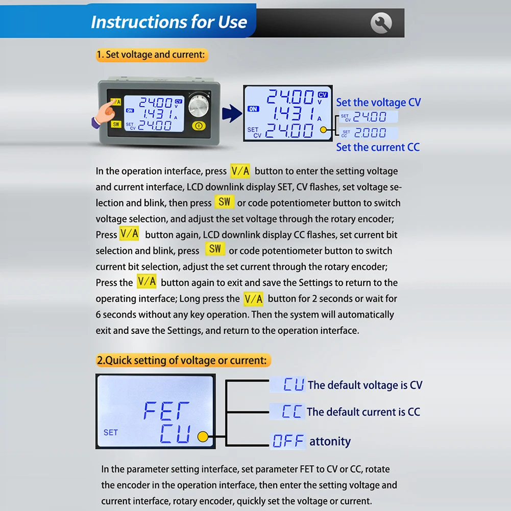 5. Удобная работа:Наш модуль постоянного напряжения прост в эксплуатации, с простыми элементами управления и меню. Эта функция гарантирует, что клиенты могут легко использовать продукт без необходимости обширных знаний в области электроники.