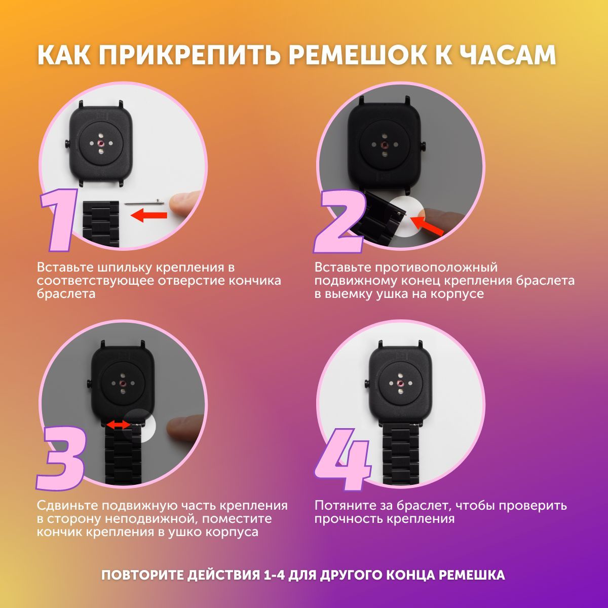 Для раскрепления звеньев необходимо вытолкнуть скрепляющий штифт, направление выталкивания выгравировано стрелками на обратной стороне звеньев браслета.