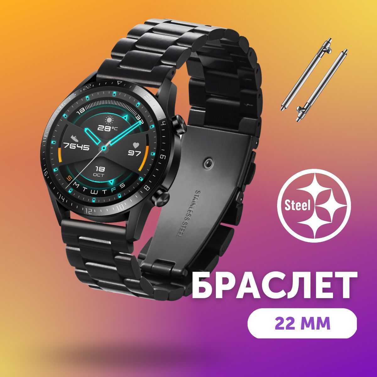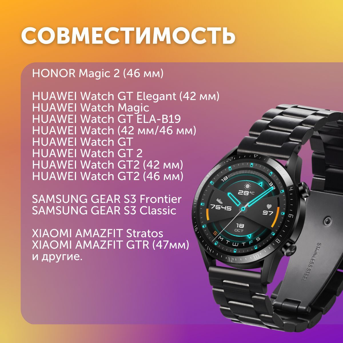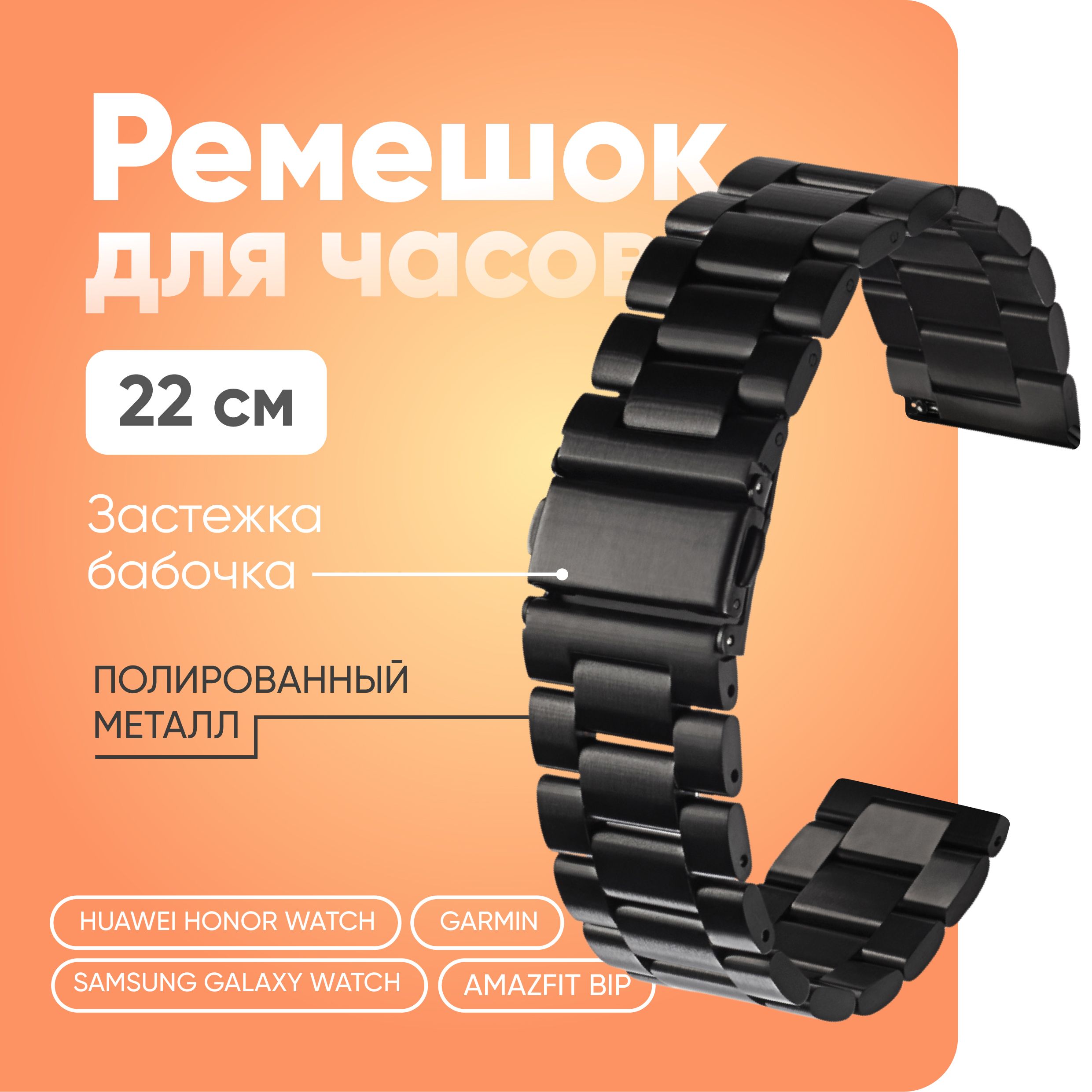• Универсальный: Универсальные крепления браслета подходят к самым разным сериям и моделям умных и обычных часов с креплением в «ушки» и шириной браслета 22 мм: Amazfit, Garmin, Honor, Huawei, Samsung, Realme и других.
