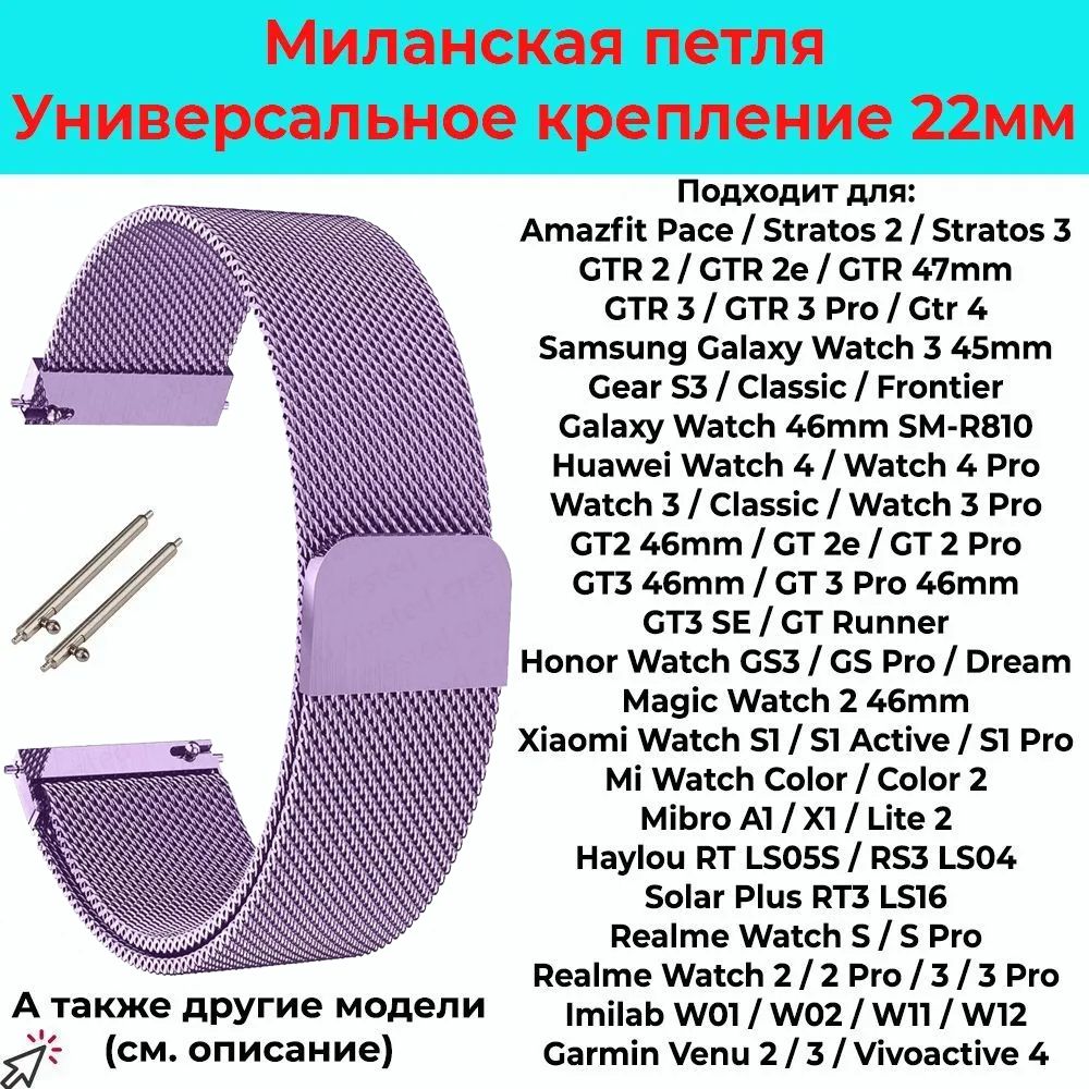 Миланский сетчатый металлический ремешок для умных смарт часов с шириной 22мм в месте крепления Быстросъёмные шпильки (штифты) - 2шт Упаковка